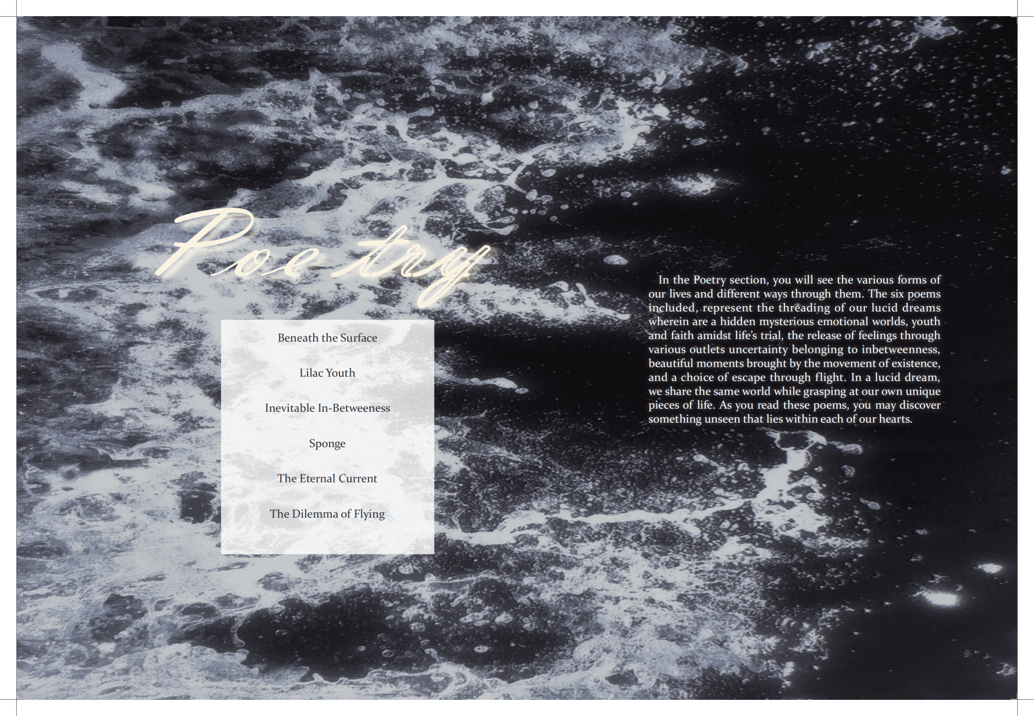 Elsewhere Issue 7.2 showcases the collective efforts of our dedicated contributors. Taking “lucid dream” as a guiding theme, this issue collects a number of works exploring the intersection of imagination and reality, demonstrating how literature can provide insight into the intricacies of daily life. We are proud of the hard work being put into creating this magazine, and we cannot wait to share it with all of you.