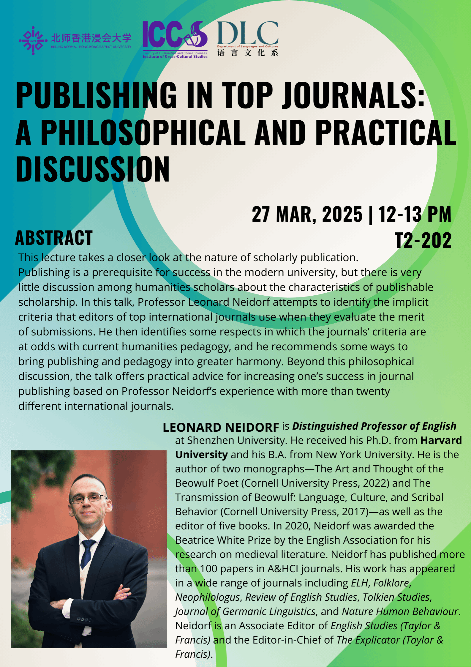 This lecture takes a closer look at the nature of scholarly publication. Publishing is a prerequisite for success in the modern university, but there is very little discussion among humanities scholars about the characteristics of publishable scholarship. In this talk, Professor Leonard Neidorf attempts to identify the implicit criteria that editors of top international journals use when they evaluate the merit of submissions. He then identifies some respects in which the journals’ criteria are at odds with current humanities pedagogy, and he recommends some ways to bring publishing and pedagogy into greater harmony. Beyond this philosophical discussion, the talk offers practical advice for increasing one’s success in journal publishing based on Professor Neidorf’s experience with more than twenty different international journals.