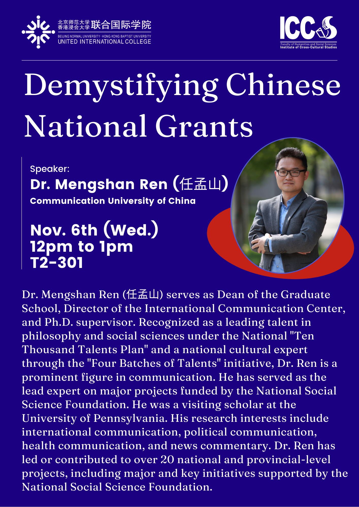 ICCS is organizing this workshop as part of a series of initiatives to foster research and academic excellence among colleagues. The first workshop presenter, Professor Mengshan Ren (任孟山), is the Dean of the Graduate School and Director of the International Communication Center at the Communication University of China.
