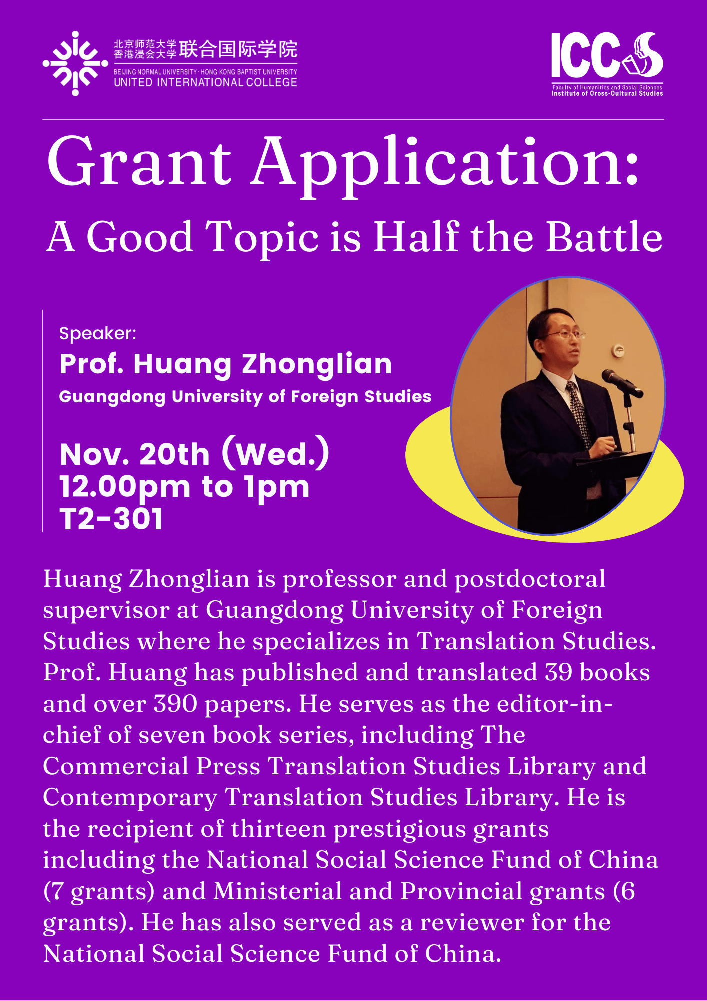 "A Good Topic is Half the Battle" – a Grant Writing Workshop by Professor Zhonglian Huang (黄忠廉) – 20th November, 2024