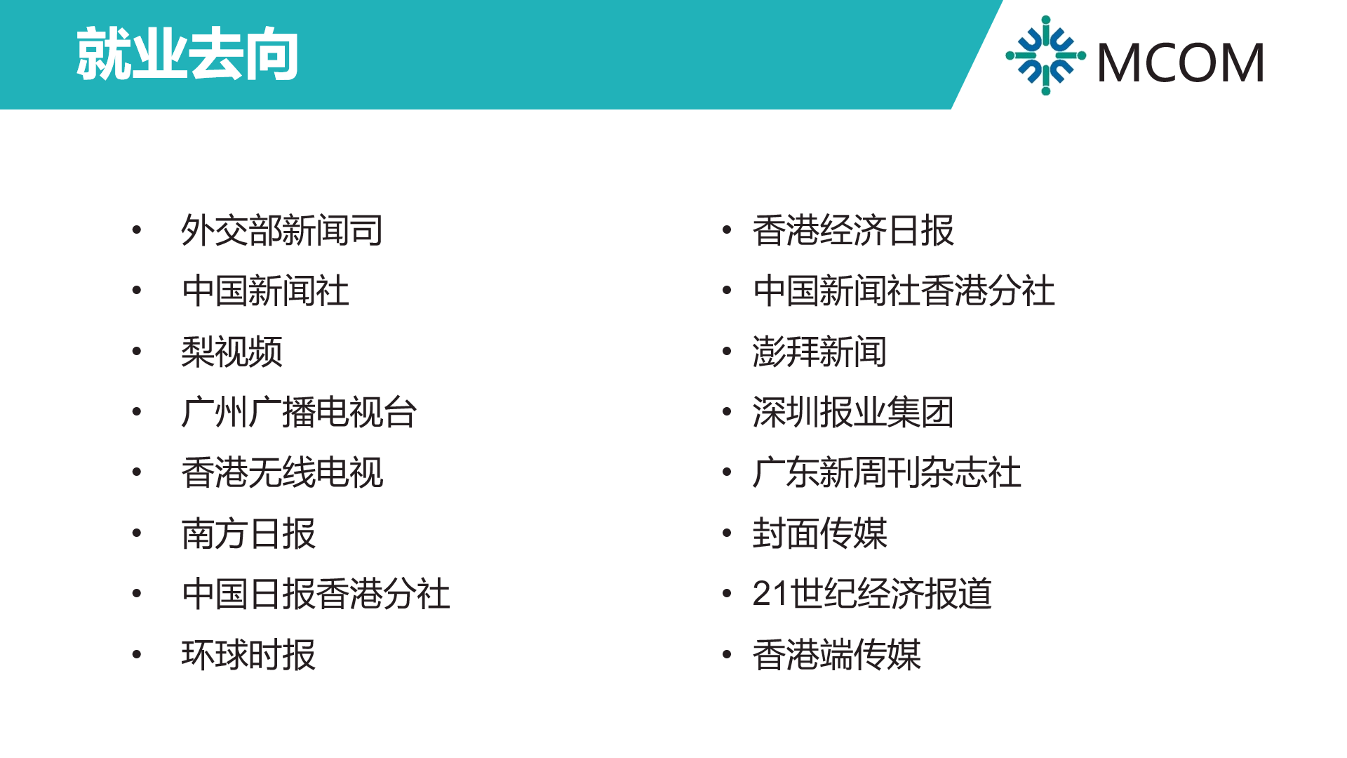 在完成四年扎实的理论及实践训练之后,媒体与传播学的毕业生可以选择到传统及新兴的媒体产业,政府和企业的宣传、公关部门,以及中外文化交流组织和传播机构等。