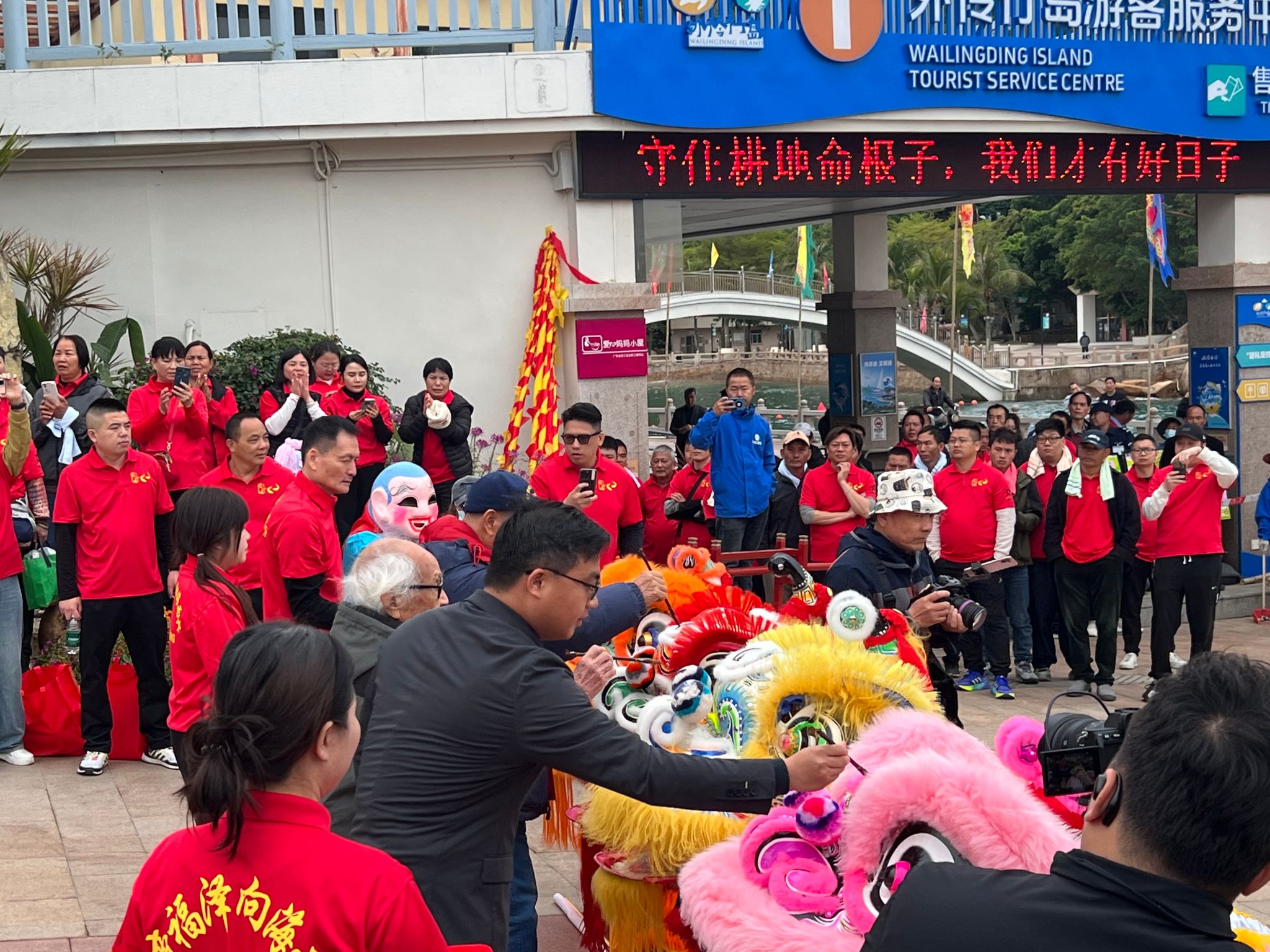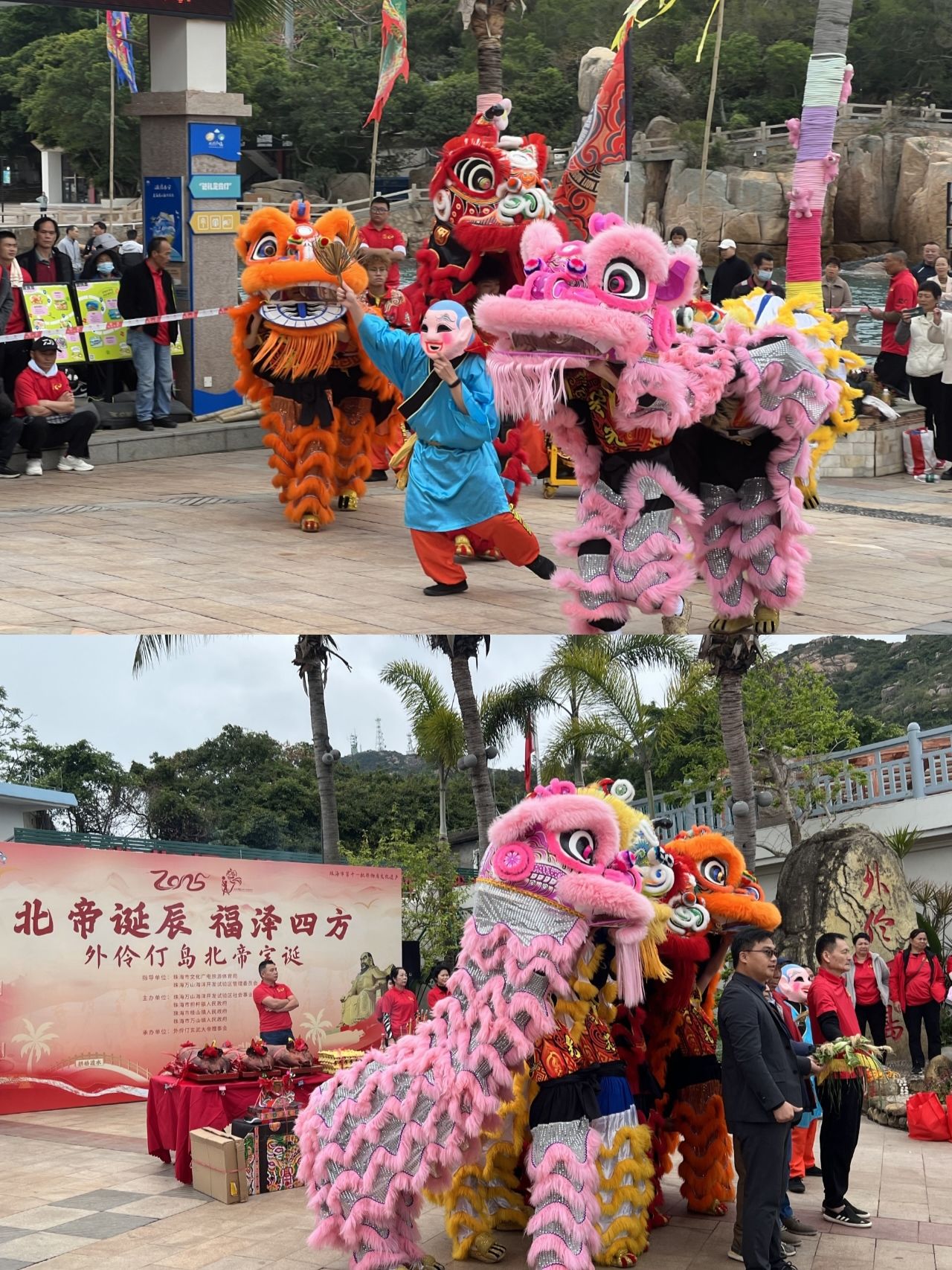 上午10:30,北帝诞庆典正式拉开帷幕,仪式以醒狮点睛开场。受邀前来的各界知名人士为四只醒狮点睛,寓意吉祥顺遂。其后,醒狮们以祭海之礼腾跃起舞,迎接四方来客。