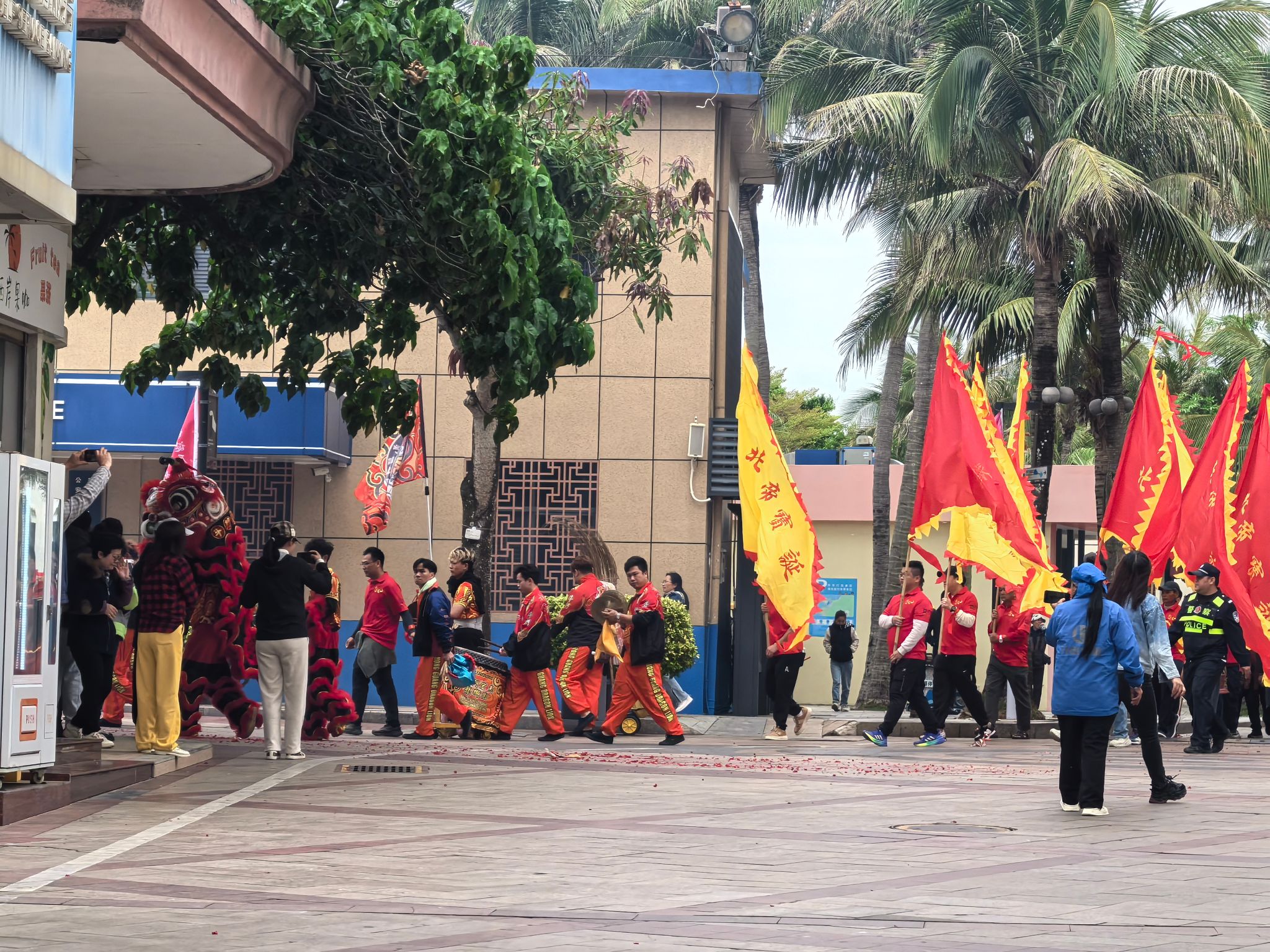 祈福仪式结束后,北帝诞理事会成员们敲响了著名的北帝晨钟,标志着北帝巡游活动开启。在钟声的引领下,醒狮再次舞动,祭祀队伍也再度出发。他们肩扛北帝像与贡品环绕外伶仃小镇,将北帝的庇佑带给每一家商户,每一户居民。