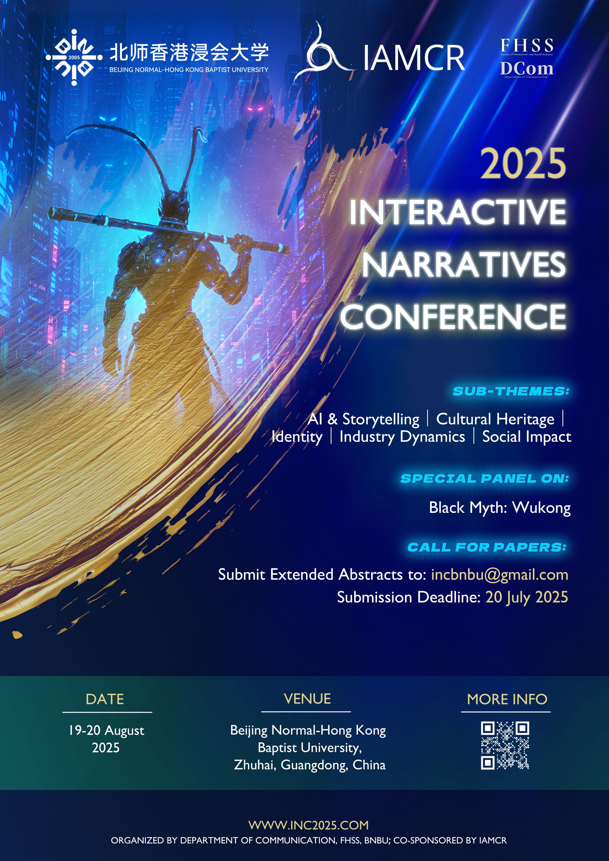Beijing Normal-Hong Kong Baptist University (BNBU), in collaboration with the International Association for Media and Communication Research (IAMCR), invites the submission of extended abstracts for the Interactive Narratives Conference 2025. This conference will be held in Zhuhai, China, from 19 to 20 August 2025.