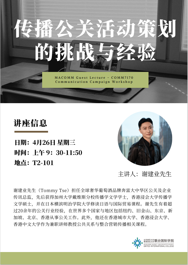 2023年4月26日,谢建业(Tommy Tse)先生受邀为UIC的同学们带来了以传播公关活动为主题的分享讲座。谢先生先后获得加州大学戴维斯分校传播学文学学士与香港浸会大学传播学文学硕士。作为奔富大中华区公关及企业传讯总监,谢建业先生有着超过20余年的公关行业经验,他曾在世界多个国家与地区,包括纽约、旧金山、东京、新加坡、北京、香港从事公关工作。此外,他还在香港多所知名高校作为兼职讲师教授公共关系与整合营销传播相关课程。此次分享会谢先生不仅分析了奔富红酒的企业营销方案,还总结了他多年的从业经验、更提出了他本人的公关理论,引起了不少师生的兴趣与参与。
