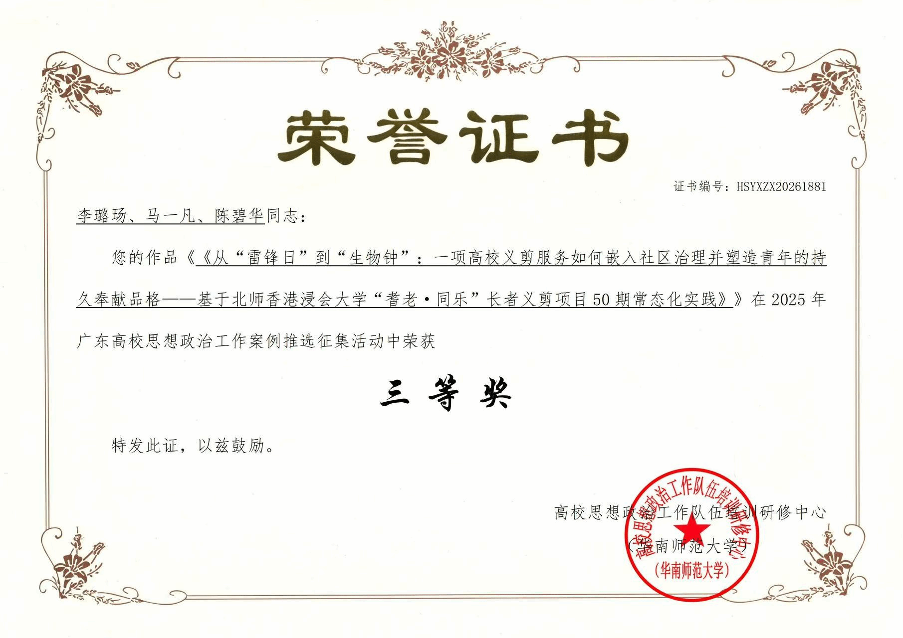 近日,2025年广东高校思想政治工作论文、案例、网络课程推选征集活动结果公布。我校在此次评选中表现突出。由北师香港浸会大学人文社科学院传理学专修课程主任李璐玚,研究生院学生第一党支部书记陈碧华,宣传委员马一凡组成的团队报送论文荣获一等奖;报送的3项工作案例分别荣获三等奖,既展现了我校在思想政治工作理论研究与实践创新方面取得的积极成果,也体现了人文社科学院关心支持学生发展、协同落实立德树人根本任务的责任担当。