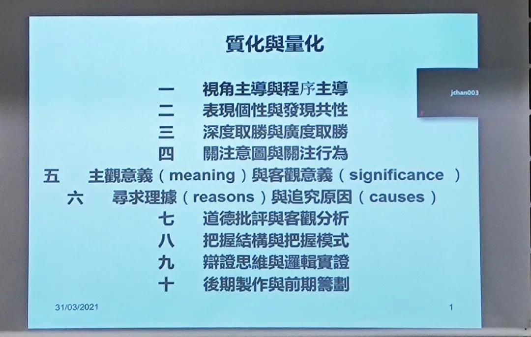 质化和量化研究在传统上依然是有两个取向的,甚至可以说是对立的,比如,做研究一开始做量化研究,往往养成做量化研究的思维,可能一生就用量化方法进行研究了,陈韬文教授补充并强调了质化量化研究的对立性。
