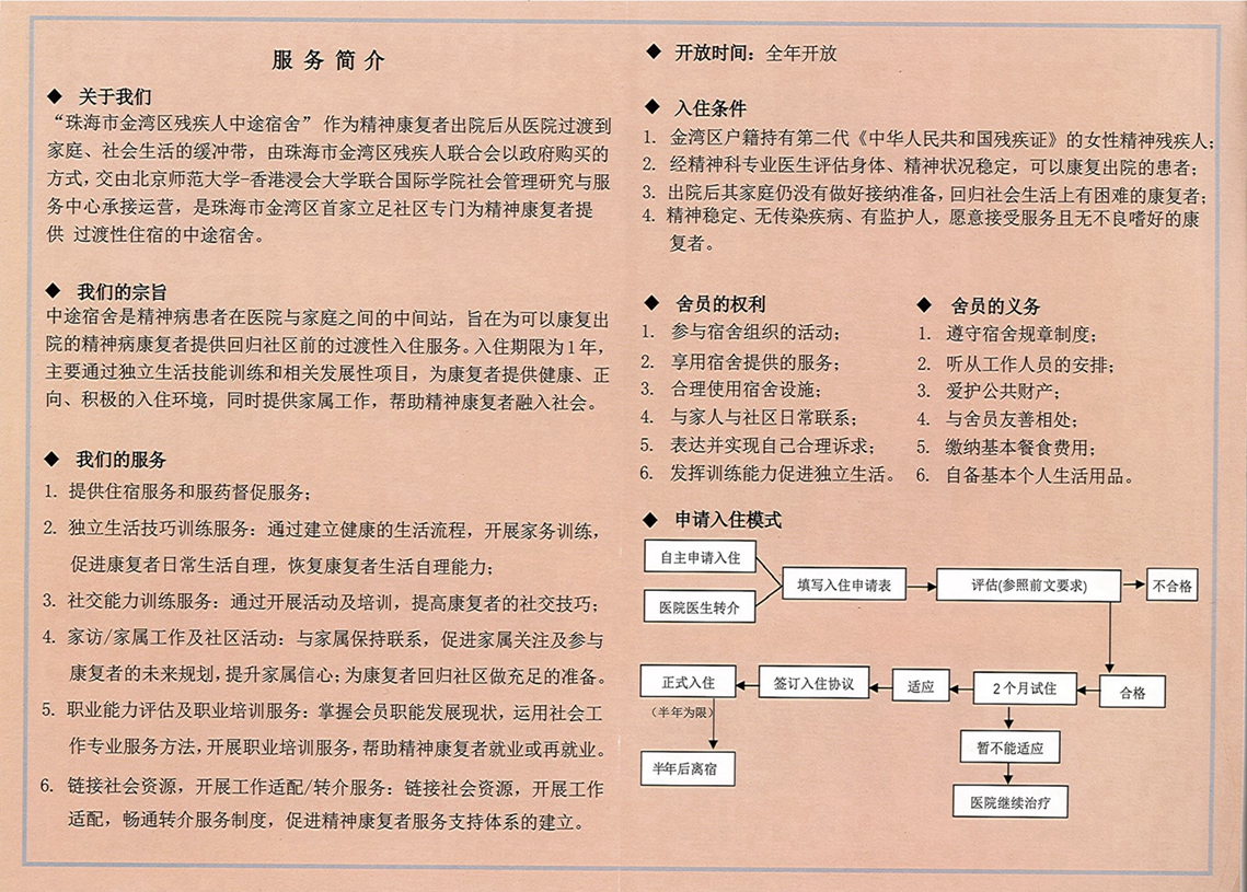 中途宿舍是精神病患者在医院与家庭之间的中间站,旨在为可以康复出院的精神病康复者提供回归社区前的过渡性入住服务。按照珠海市相关政策,中途宿舍的入住期限为6个月,主要通过独立生活技能训练和相关发展性项目,为康复者提供健康、正向、积极的入住环境,配合家属工作,帮助精神康复者融入社会。