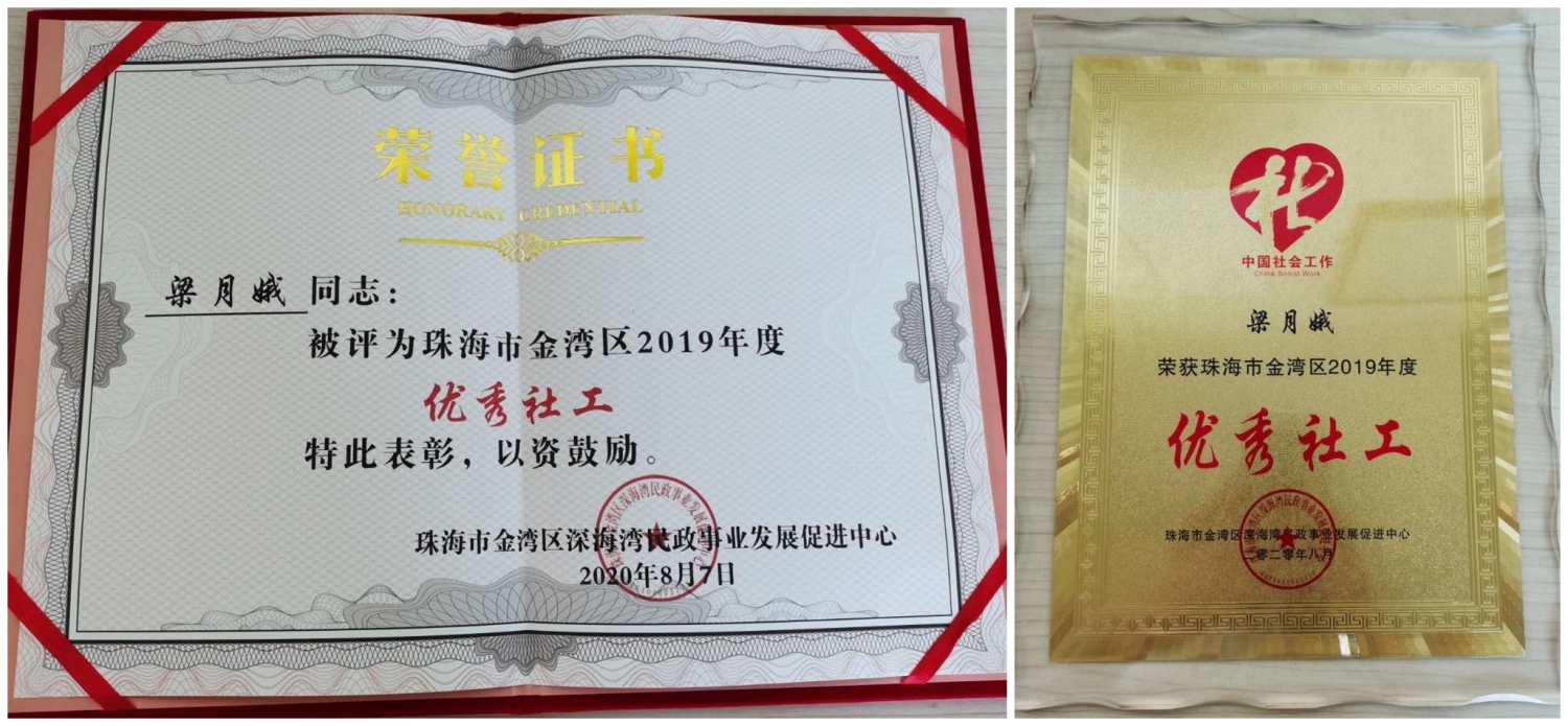与此同时,“红旗镇残疾人康园工疗站运营管理项目”的社工梁月娥女士获得“珠海市金湾区2019年度优秀社工”荣誉。