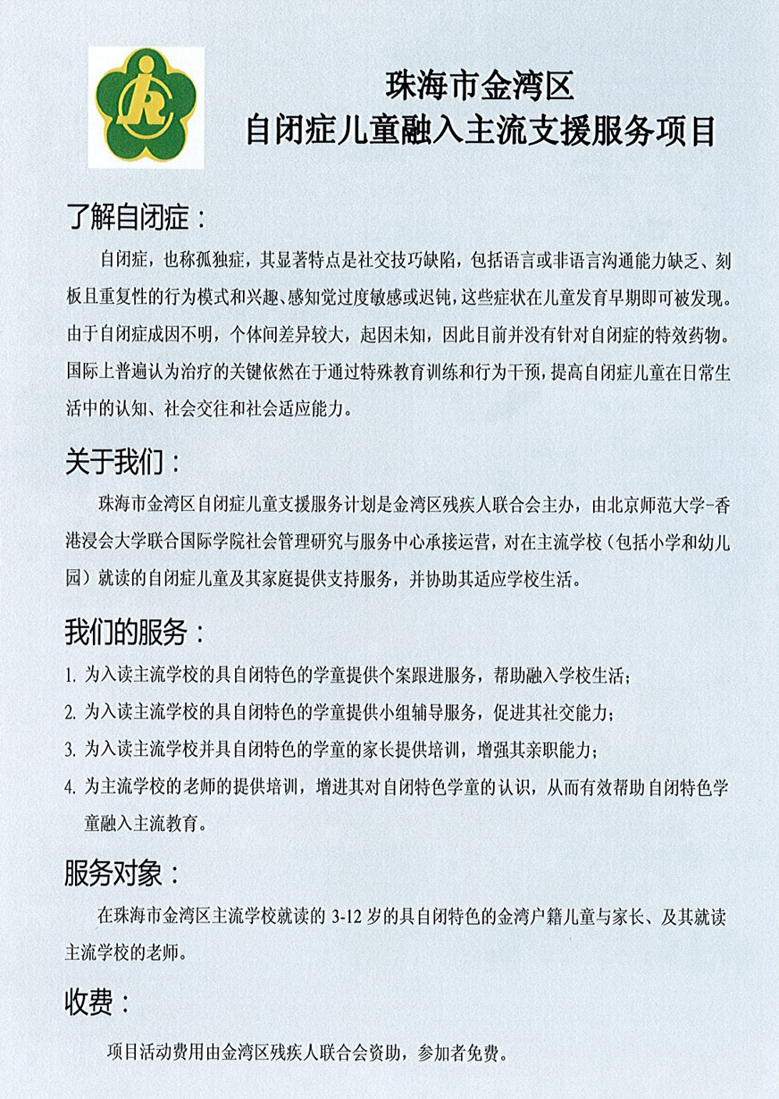 2017年7月,珠海市金湾区残疾人综合服务中心与北京师范大学-香港浸会大学联合国际学院(简称UIC)为金湾区户籍自闭症儿童进行支持服务,对自闭症儿童的共37户家庭开展了全面的联系摸查工作,在香港教育辅导专家的督导下,开展了卓有成效的个案跟进、亲子小组、家长教育工作坊、主流学校老师讲座、社区宣传教育等,经过一年的努力,自闭特色儿童的社交能力有所提升,亲职关系得以缓和,家长支持网络得到初步建立,学校和老师为接纳特殊孩子就读做了更优良的准备。在总结服务经验的基础上,我们也看到,若要持续帮助自闭症儿童及其家庭获得更多支持,增加他们的内生自信和能力,仍然需要在人员配置、场地安排、专业支持方面努力。因此,珍惜几经辛苦建立起来的自闭症家庭的联络网络,继续加强合作,是满足金湾区自闭症儿童及其家庭需求的必然选择,UIC愿意继续发挥专业资源优势,携手珠海市金湾区残疾人联合会共同努力。