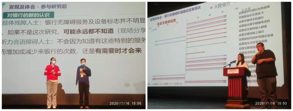 社会管理研究与服务中心研究助理吴佳玲女士在会上做了题为《珠海市金融服务无障碍调研及体验》专题经验分享,两名来自“红旗镇残疾人康园工疗站运营管理项目”学员也在大会上总结前期实地调研体验及发现。参与本次行动研究的还有社会管理研究与服务中心项目总监吴耀辉老师和项目统筹干事许婷女士。本次研究组织了一群残障人士及其家属到珠海市某银行的两家营业厅实地考察,检验无障碍设施与服务的情况。