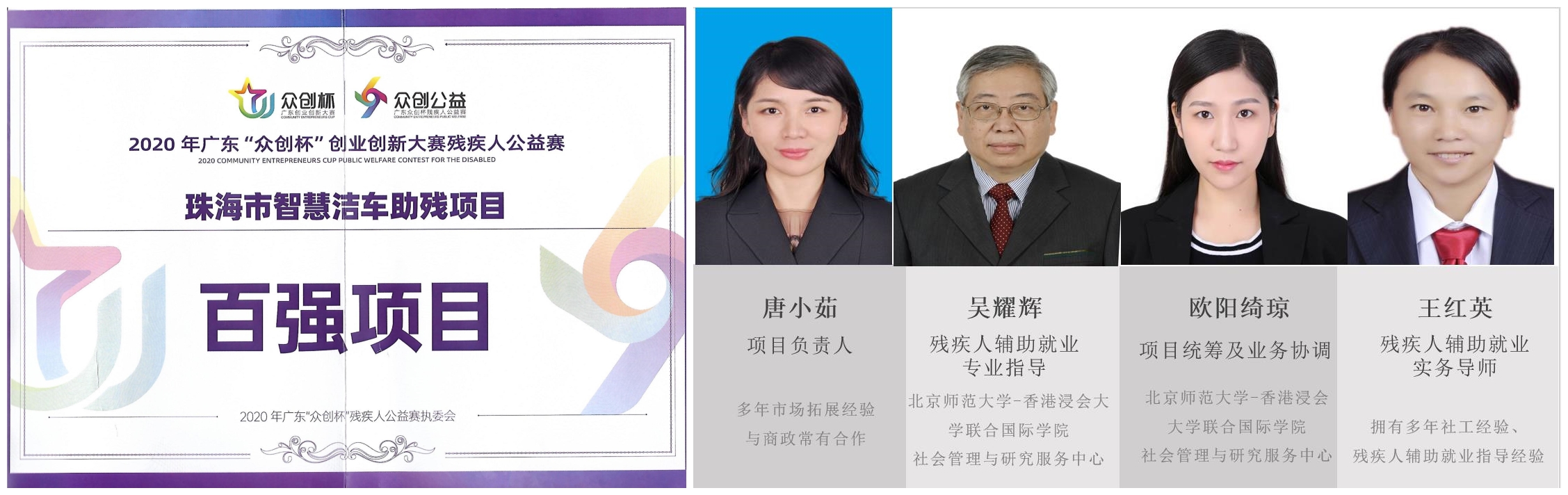 智慧洁车项目筹备之初,北师港浸大社会管理研究与服务中心(CSMRS)积极参与,为项目提供残疾人就业情况分析及社工经验分享,参与建立项目管理模式、厘清职业导师岗位职责及其与残疾学员的日常工作关系。与此同时,管研中心(CSMRS)对智慧洁车项目参加了2020年广东省“众创杯”残疾人公益赛提供充分支持,结合社会工作理论,建立具有操作性和创新性的运营模式,推动项目获得 “百强项目”称号。
