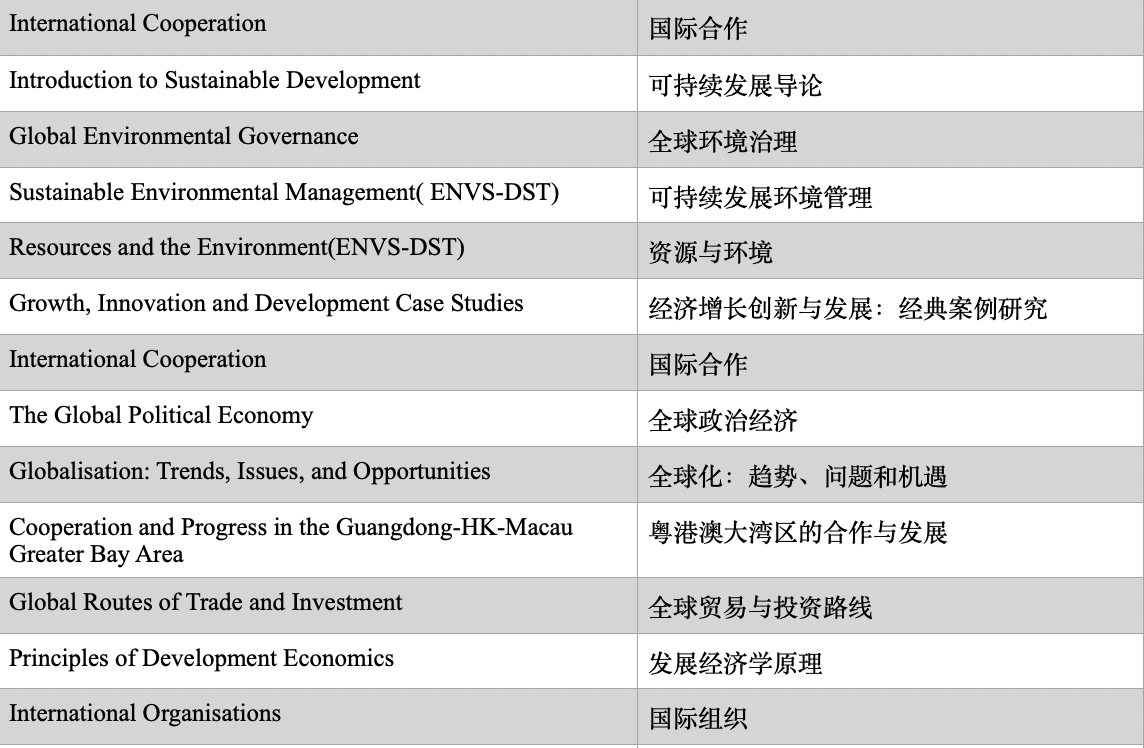 基于可行性原则,灵活性原则,相关性和跨学科原则的理念,参与全球化与可持续发展副修项目的学生应当完成以下13门课程中的任意5门(不需要任何先修课程),13门课程中的11门为全球化与发展专业学习规划中提供给其大二至大四的固定课程,2门为环境科学专业的专业必修课: