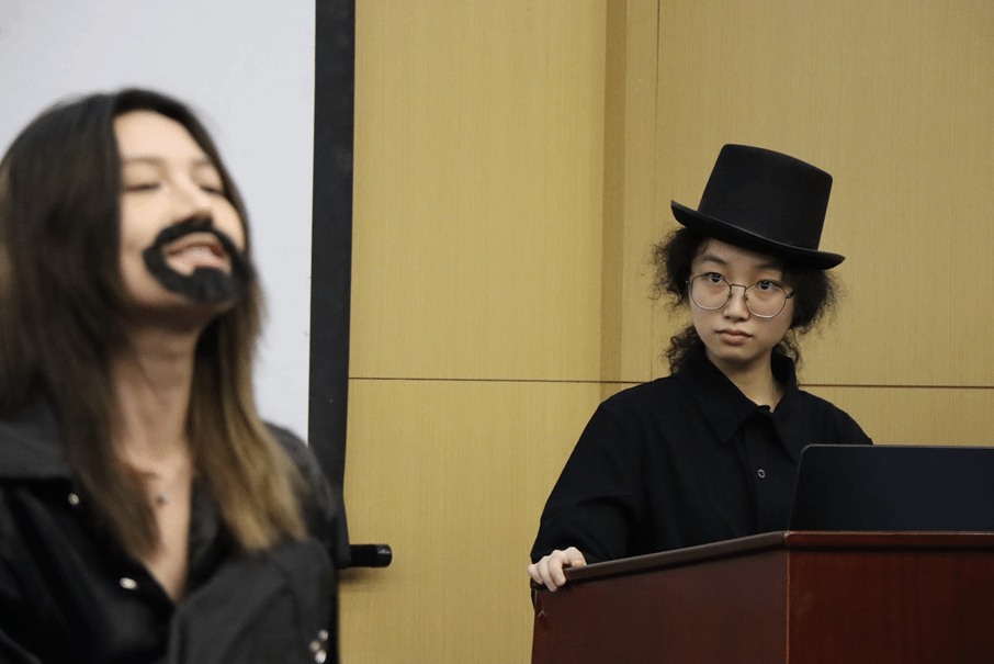 "我曾是个怯于舞台表演的人。通过戏剧课程,我尝试突破自我——在这次活动中我饰演与自己性格截然相反的武士角色。为了演好这个角色,我决定逼自己走出舒适区,尽力完成我的‘使命’。我们同学的表演令人惊艳,我们互相学习、提出改进建议,这对打磨整体演出效果大有裨益。整场活动充满乐趣,让我深深感受到英语文学研习专业(英语语言文学系)就像个温暖的大家庭!"(余雯琪)