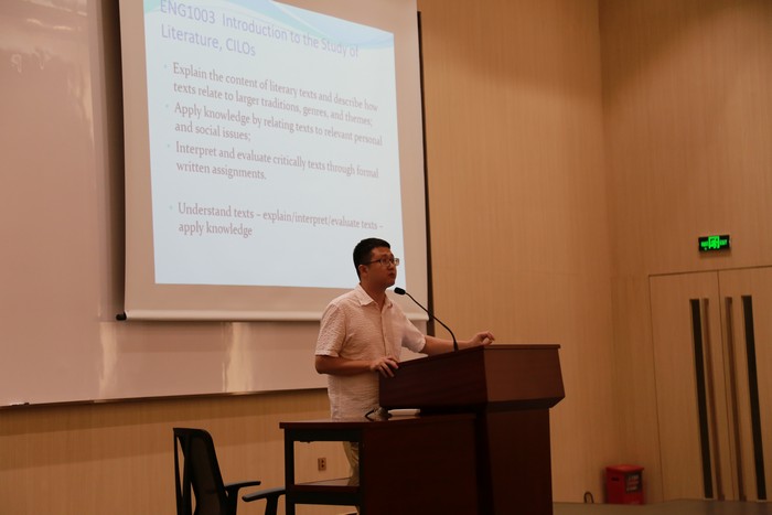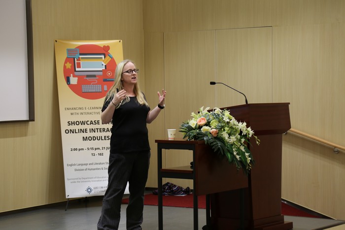 The Parallel Sharing Session 1 was hosted in T2-101, while the second session was being hosted concurrently in T2-102. DHSS Associate Professor and Programme Director for English Language and Literature Studies (ELLS), Dr Edith Yan, was the Chair for Session 1. Session 1 began with DHSS Assistant Professor, Dr Xi Xu, presenting ‘Online Learning of Figurative Language Through Articulate Rise’. His presentation examined how an online learning exercise had been designed and applied to help Year One students learn figurative language. The exercise had been created by ‘Rise’, which is a feature of the online interactive learning software Articulate. Dr Xu’s presentation covered three aspects. Firstly it explained the purpose of designing the exercise and its connection with the Course Intended Learning Outcomes. Secondly, Dr Xu spoke about the basic structure of the exercise and the problems before finishing with the feedback from students that was obtained through questionnaires and interviews. Advantages and disadvantages of using this online exercise were discussed.