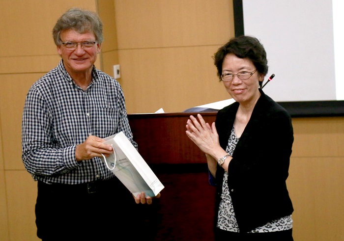 Dean of DHSS, Prof Mei-hwa Sung presents Professor Britton with a gift after thanking him
