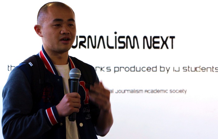 The third person to speak was Year 2 IJ student, Yin Lanjing, who spoke about when she went to Zhuhai television station and they were trying to create a news app. She finished off by explaining that all people can be journalists.