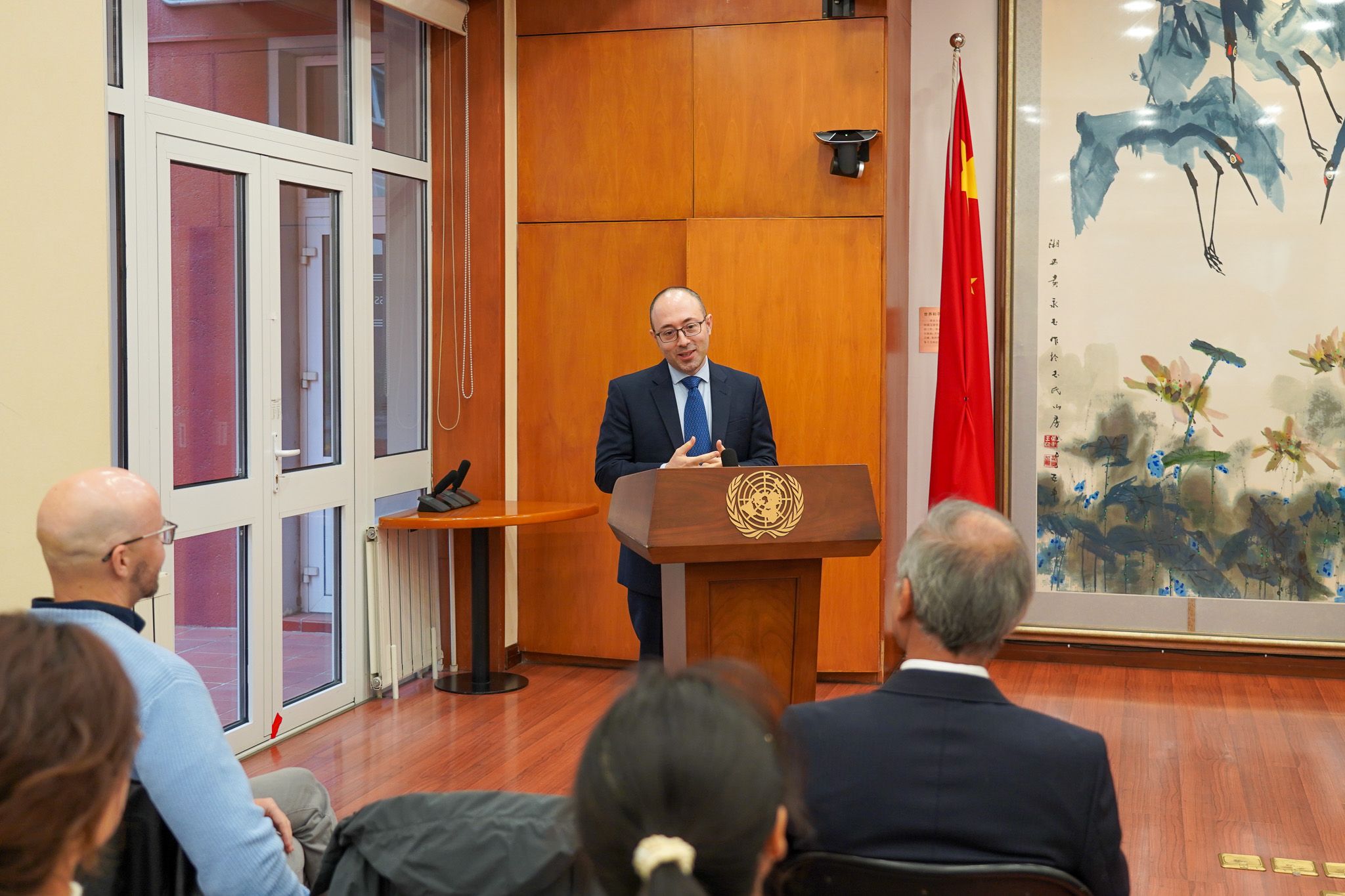 Department Head Dr. Edoardo Monaco briefing at the meeting room of the UN Building