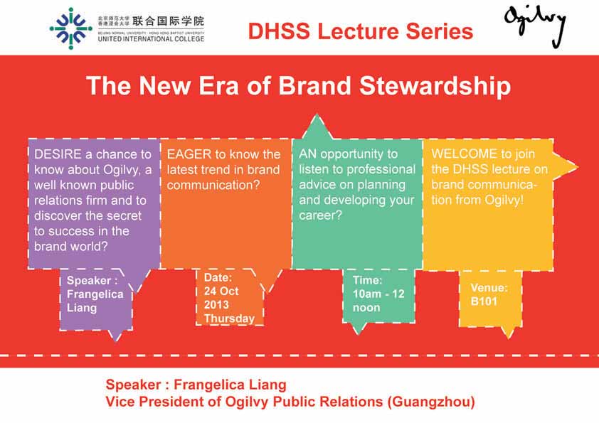 Ms. Frangelica Liang, Vice President of Ogilvy Public Relations, Guangzhou, and a veteran of more than 15 year in-house and consultancy experience in marketing and communications, will share interesting stories of Ogilvy and the hottest brand knowledge. She will also offer recommendations for students who aspire to become brand stewards in the fast-growing market.