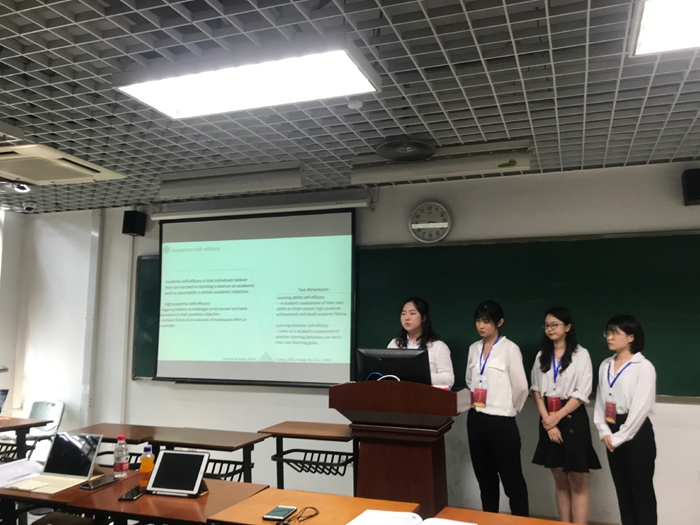 The four Year 3 students were Zhang Lu (Lucy), Li Yitong (Rachel), Zhang Huimin (Elsie), and Zhu Runyu (Grace) of the Applied Psychology (APSY) programme. Four of them together presented the findings about academic self-efficacy on English-as-a-foreign-language learners, which was an extension of one of their term papers.