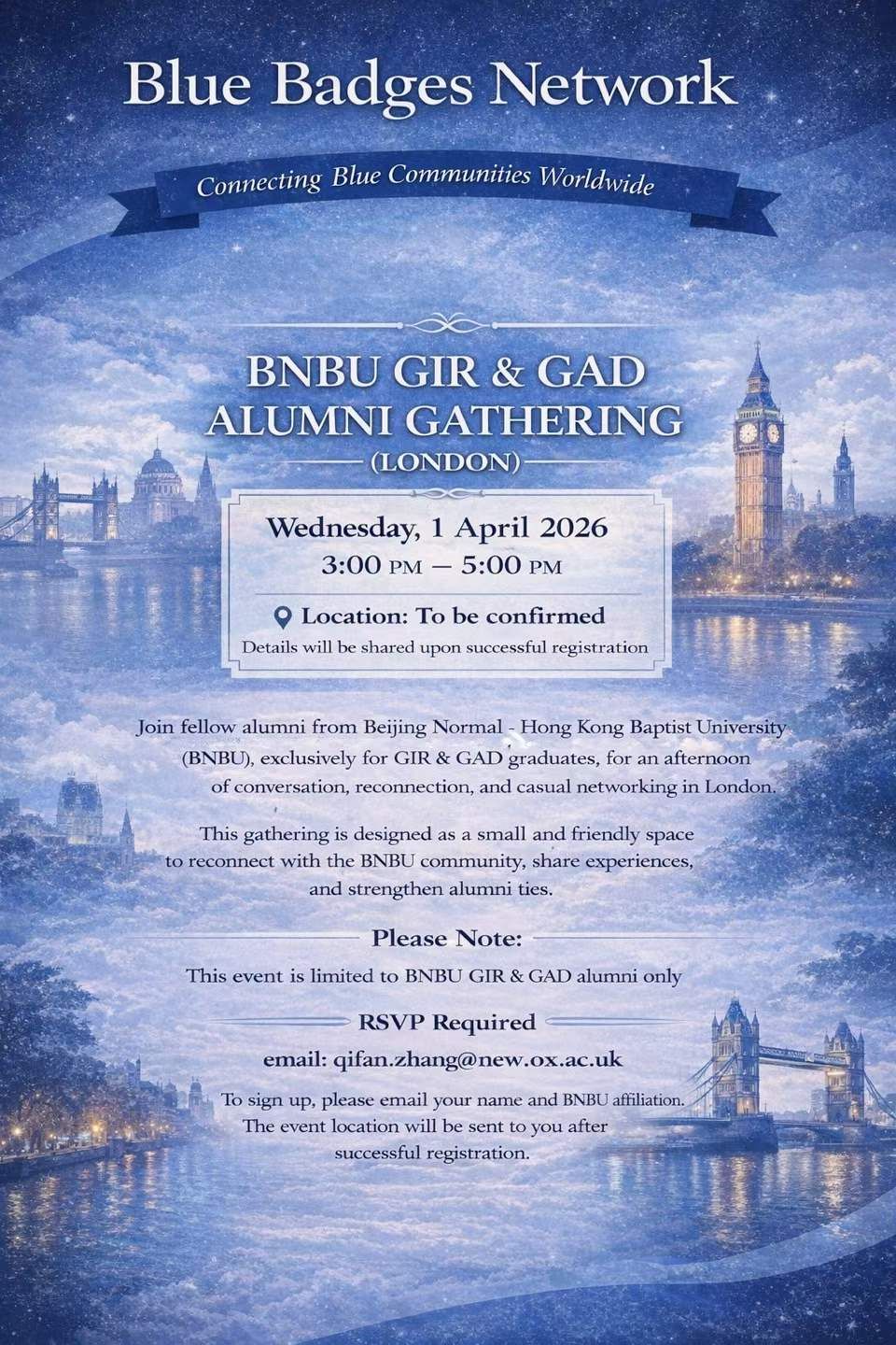 2026年3月18日周二晚,北师香港浸会大学伦敦中心成功举办首届BNBU,耶鲁和牛津大学的“蓝徽大学校友聚会”(Blue Badges Network)——这三所学校的校徽主色调都是蓝色。也正因如此,“蓝徽”主题应运而生。作为本次“蓝徽大学校友聚会”的发起方,BNBU伦敦中心在活动筹备、组织与校友联络中发挥了核心推动作用,为跨校交流提供了重要平台。特别值得一提的是,2021届国际关系(GIR)专业毕业生张震同学,目前在爱丁堡大学攻读历史学博士。他从温哥华经多伦多中转,抵达伦敦机场后便拖着行李直接赶来参加活动,并于当晚乘坐长途火车返回爱丁堡。他的到来不仅体现了对校友网络的高度重视,也让在场校友们深受感动。本次活动虽为首次尝试,却展现出蓝徽校友之间强大的凝聚力与行动力。在校友们的共同参与与支持下,蓝徽校友聚会必将不断发展壮大。