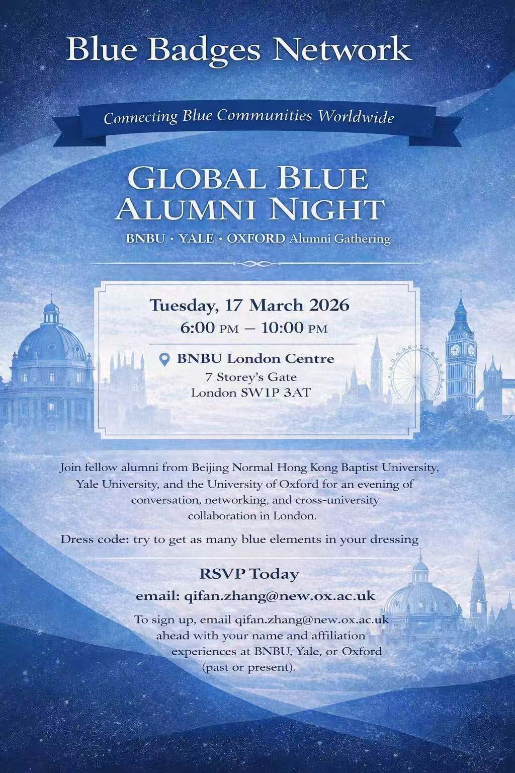 On the evening of Tuesday, 18 March 2026, the London Centre of Beijing Normal - Hong Kong Baptist University (BNBU) successfully hosted the first “Blue Badges Network” alumni gathering, bringing together alumni from BNBU, Yale University, and the University of Oxford. The theme “Blue Badges” was inspired by a shared feature of the three institutions—the dominant blue color in their university crests. As the initiator of the event, the BNBU London Centre played a central role in its planning, organisation, and alumni outreach, providing an important platform for cross-university exchange.