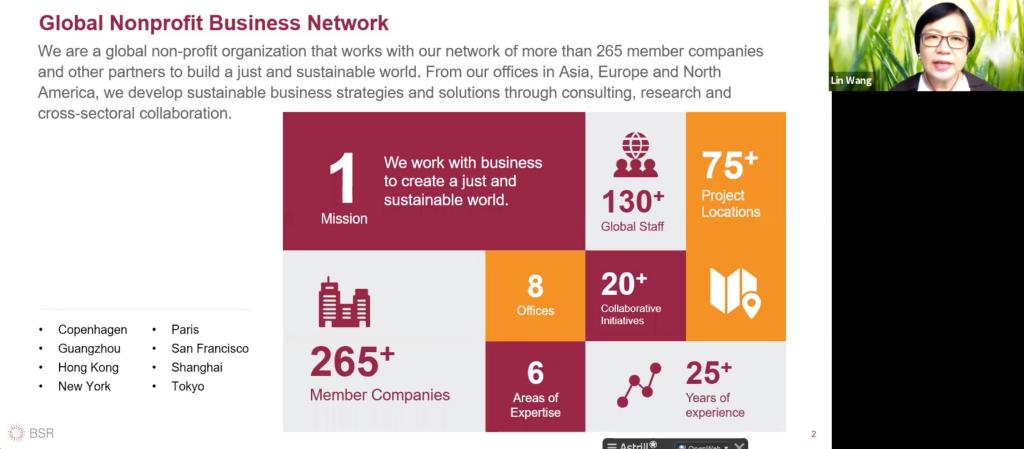 Ms. Wang explained how, essentially, BSR engages in “factory management capacity building” as a form of grassroots promotion of UN sustainable development goals along increasingly complex and impactful global value chain systems.
