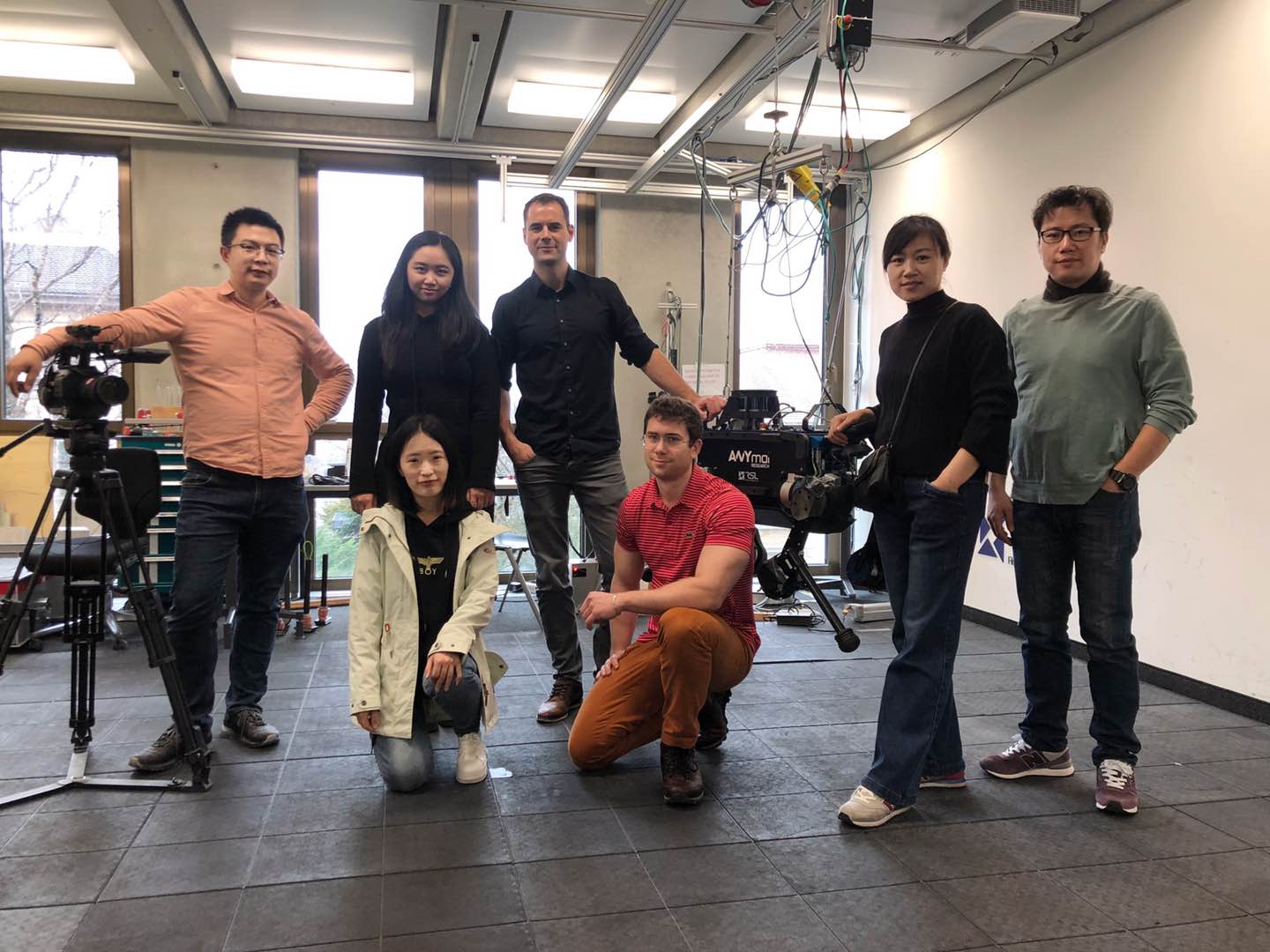 翁静莹(二排左二)与同事一起拍摄苏黎世联邦理工学院的ANYmal机器狗