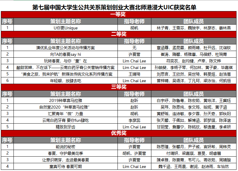 UIC全国一等奖获奖队伍为跨专业组队,成员包括:PRA2017级的姜林燕、王雪芬、林子青和数据科学与大数据技术2017级的魏骏宇、林彦志。今年4月,“第七届中国大学生公共关系策划创业大赛”走进UIC,成功举办了校园巡讲会。UIC学子对公关策划的兴趣被点燃,也因此掀起了一股参赛热潮。据统计,我校共有19支队伍报名参赛,与全国一千多所参赛高校激烈竞争,最终有16支队伍荣获佳绩,获奖率高达84%。