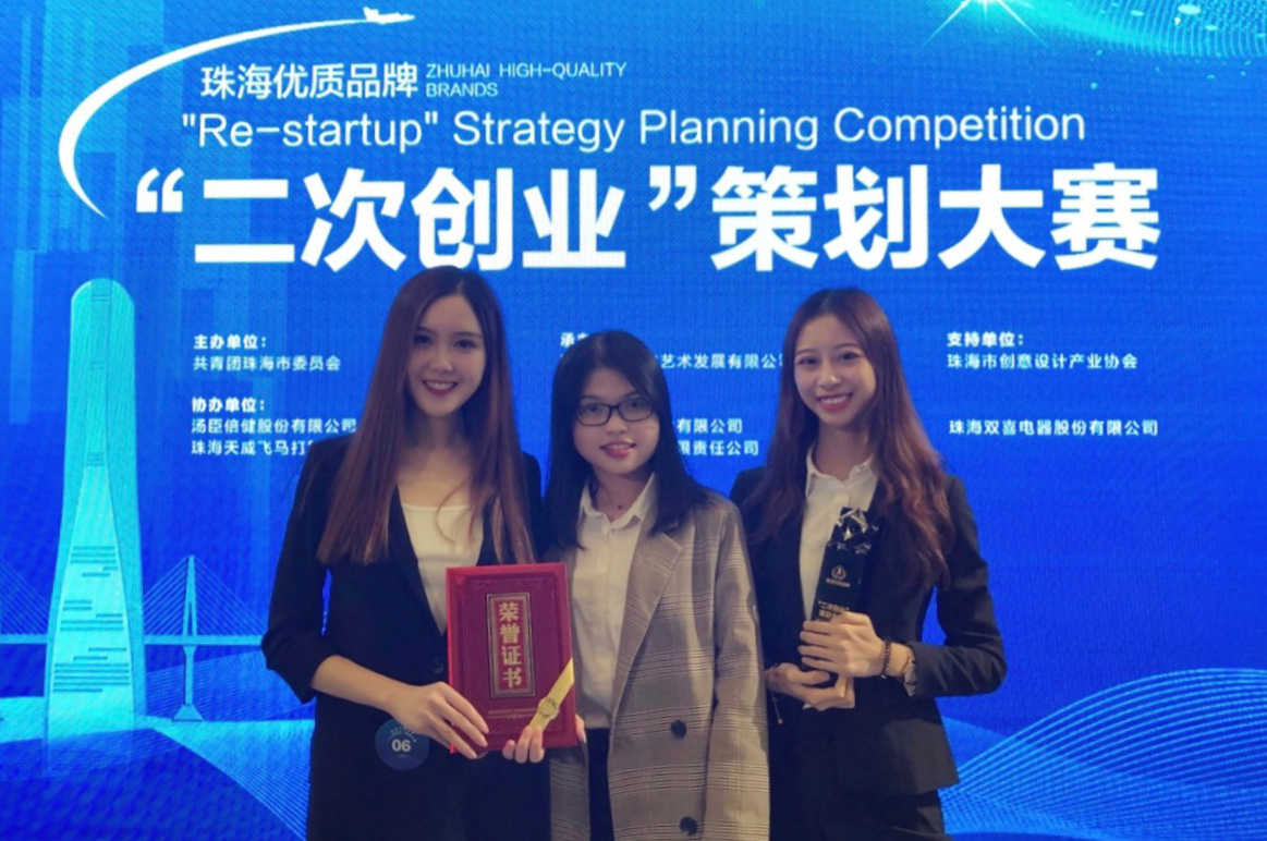 2018年12月2日,由珠海团市委主办的珠海优质品牌“二次创业”策划大赛决赛于珠海电视台新闻发布厅举办。大赛共收到来自专业广告设计公司、高校团队和个人提交的作品147件。经过初赛和网络投票的层层甄选,15组选手成功入围决赛。其中,6组选手是来自广告设计公司的业界人士;9组选手是来自高校,初试羽翼的学生团队。最终,大赛总分前三名均由专业团队包揽。由UIC公共关系与广告学专业(PRA)学子(16级解博涵、黎佩姗、付靖妍)组成的团队凭借出色表现,以总分排名第四,学生团队排名第一的成绩荣获大赛三等奖。