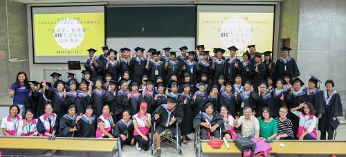 课程结束后,长者们穿上学士袍,戴上学士帽拍照,兴奋不已。四维教育协调处处长关凯玲博士、社会工作与社会行政专业署理课程主任吴耀辉先生和全人教育办公室的唐艺珊老师为大家颁发了证书。