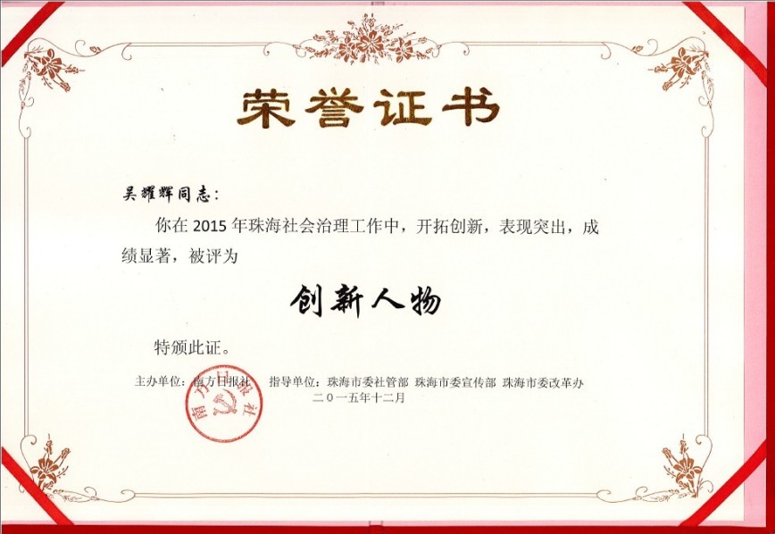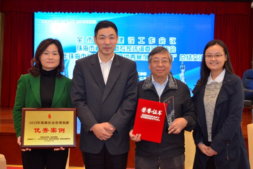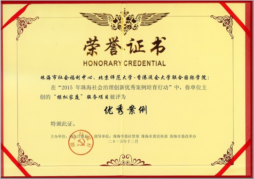 今年6月18日,“2015年珠海社会治理创新优秀案例培育行动”正式启动,UIC社会管理研究与服务中心联合珠海市社会福利中心报送的项目在项目初审、公众投票、孵化提升、多方联合评审、总结交流等环节表现突出。市社会福利中心的孤残儿童从以前的“大院舍照顾”,到如今的“小家庭养育”,其生活环境和心理情绪的改变让专家评审印象深刻。最终,综合公众投票结果和评审团打分结果,该项目成为本年度珠海市15个优秀案例的其中之一,受到社会各界的广泛肯定。主创吴耀辉老师也获颁“2015年社会治理工作创新人物”。