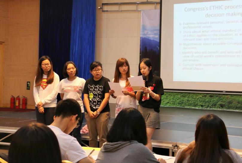 当天下午,邓美结博士在B102为四校同学讲授关于应用伦理学(Applied Ethics)的公开课。邓美结博士在公开课中为大家介绍了社会工作者协会(NASW),讲授了伦理决策过程、社会工作价值和道德等内容。她介绍,社会工作价值是个别化、案主自决、保密、接纳、不批判的态度、合理界限的设定、社会公义。
