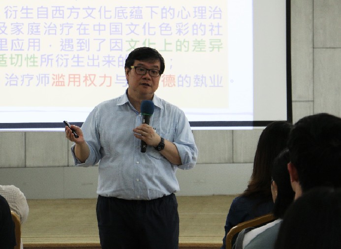 朱志强博士的讲座以“助人科技,尤其是心理治疗对社会工作实务的贡献与限制”为题,他在讲座中提到社会工作在心理治疗和家庭治疗方面的现状和问题。