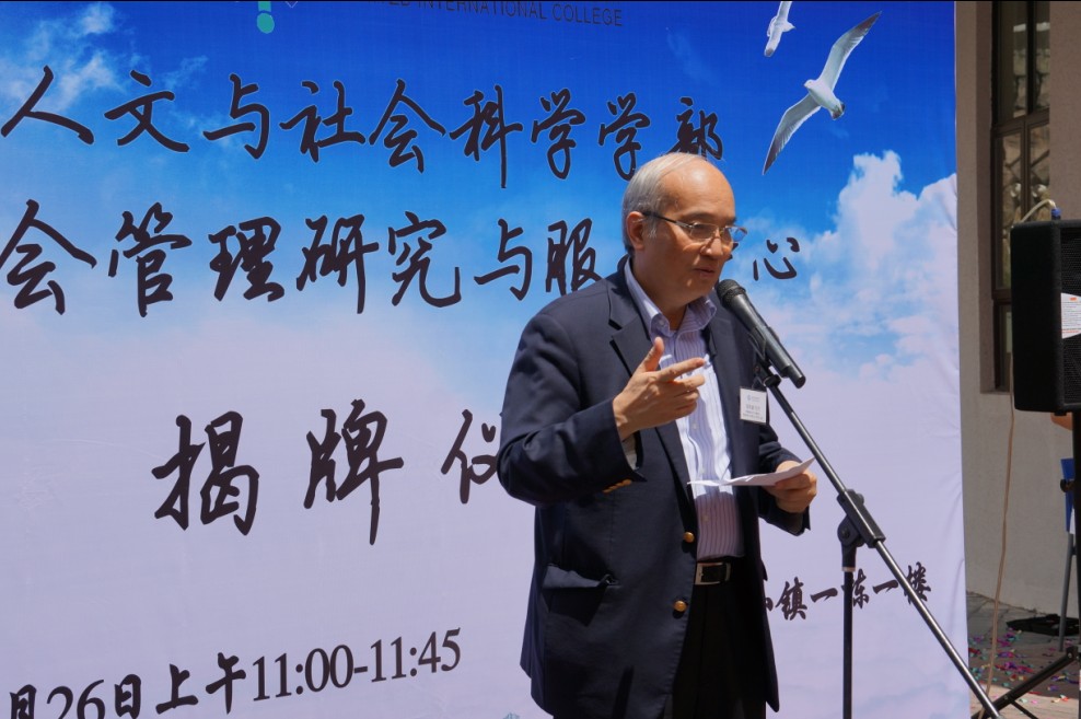 珠海市委政法委副书记、社管部副部长赵彦庆,香港浸会大学荣誉大学院士、国际服务社亚洲及太平洋区总监邱浩波,香港浸会大学社会工作系校友会副会长林绍裘,香港浸会大学社会工作系副系主任、实习统筹主任、青年研究与实践中心主任秦安琪,珠海市社会福利中心院长吴克坚等具有丰富社会管理经验的人士来到现场,与UIC校长吴清辉教授、副校长徐是雄教授、张聪教授,人文与社会科学学部院长宋美璍教授等一起出席了UIC 社会管理研究与服务中心揭牌仪式。