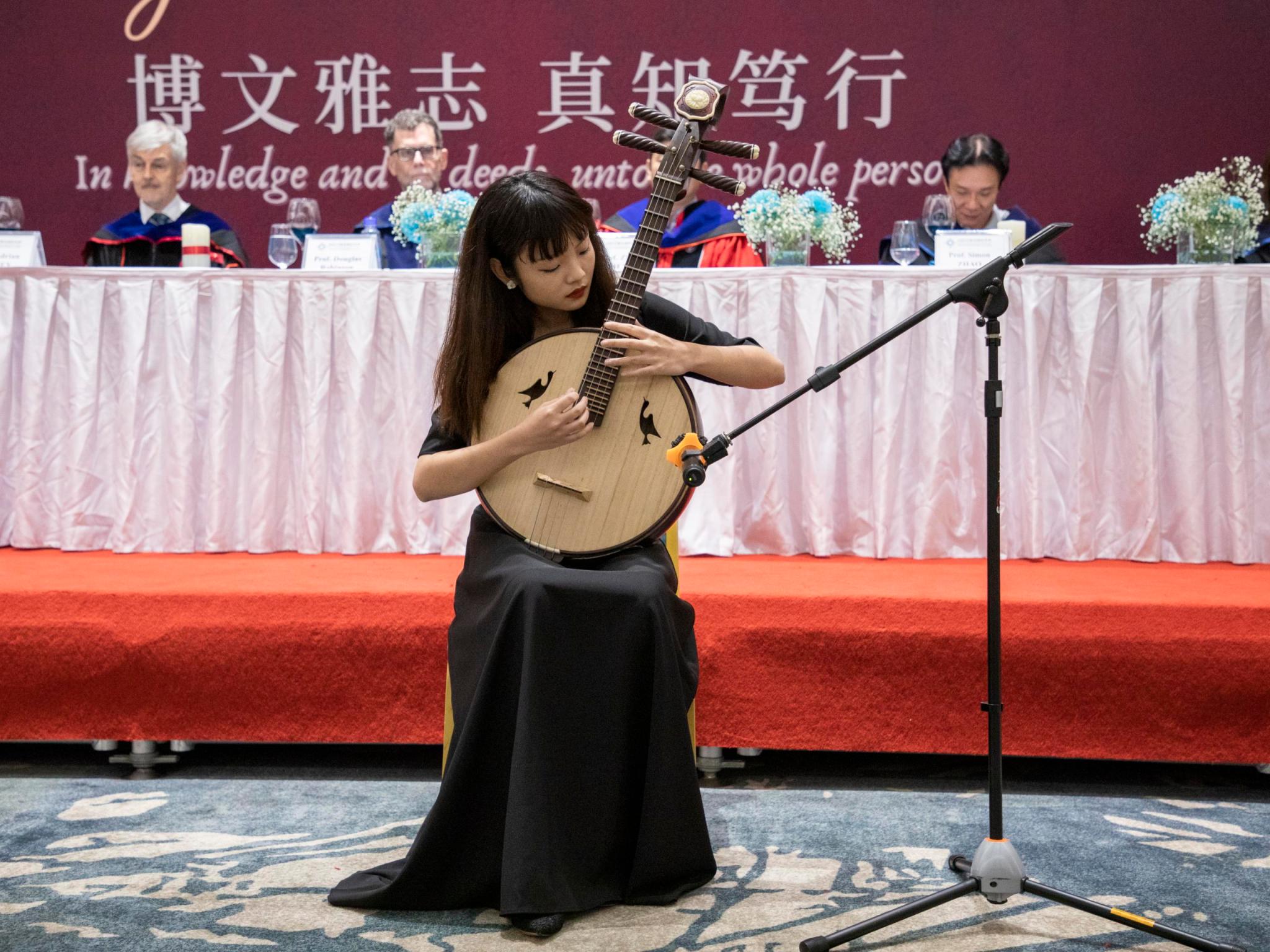 晚宴上,杜文雨萱(2019级影视专业)带来《丝路驼铃》的中阮演奏,隆文威(2021级新闻传播大类)与黄天俊(2021级外国语言文学类)带来《鸟》的第二乐章。