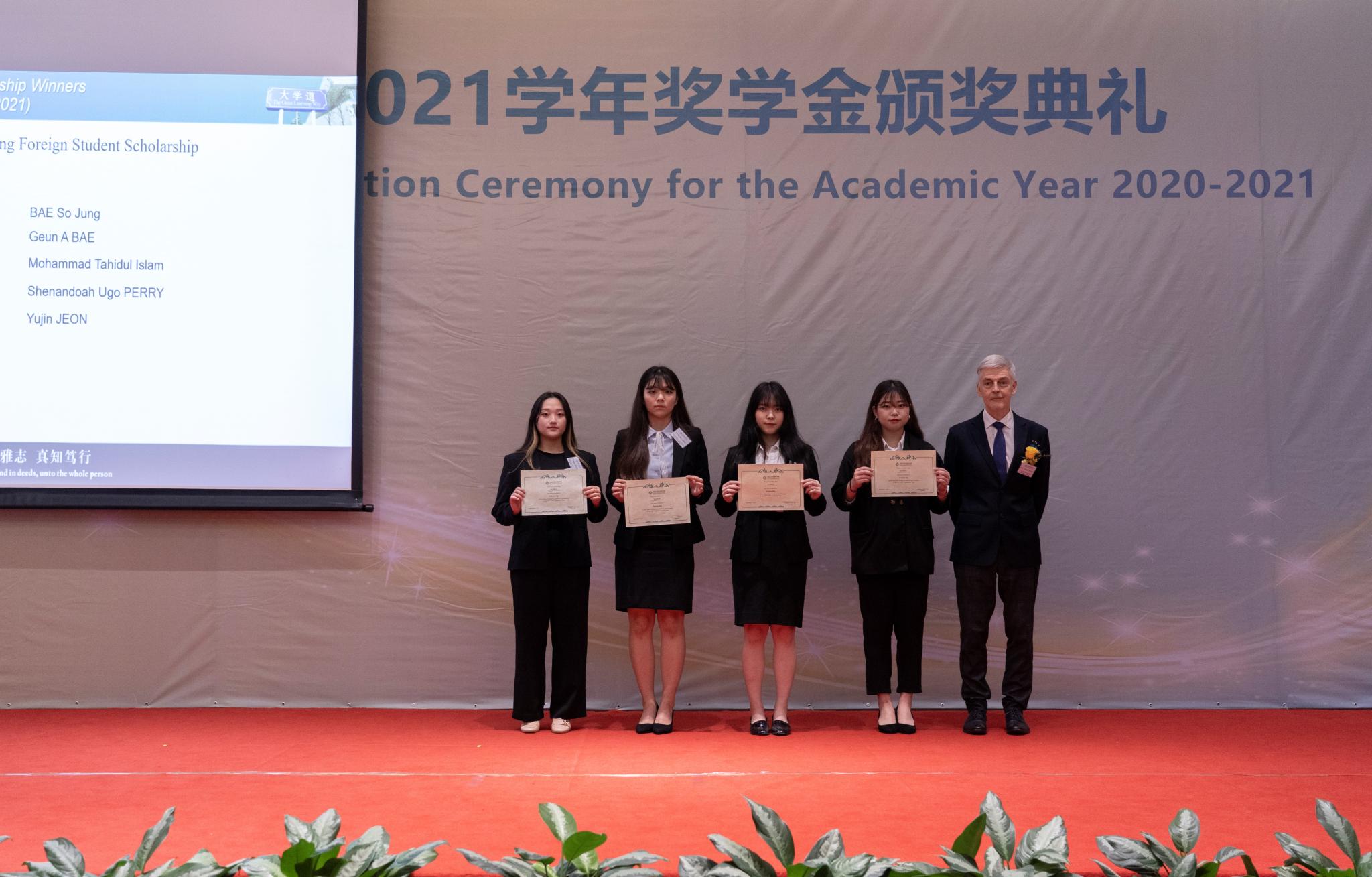 2021年12月8日,2020-2021学年奖学金颁奖礼在UIC大学礼堂举行。27名学生获得了各项殊荣。其中大四的姜许国蓉同学获得了许嘉璐全人教育奖。钟宇怡同学获得了院长推荐奖学金。王月娇同学获得了蜜蜂科技Beeplus奖学金。大三的Yu Kyung JEON 同学获得了广东省政府来粤留学生奖学金。张启凡同学获得冯燊均先生国情国学教育优秀学生奖学金。8名同学获得一等奖学金。14名同学获得二等奖学金。7名同学获得UIC实习实践奖学金。