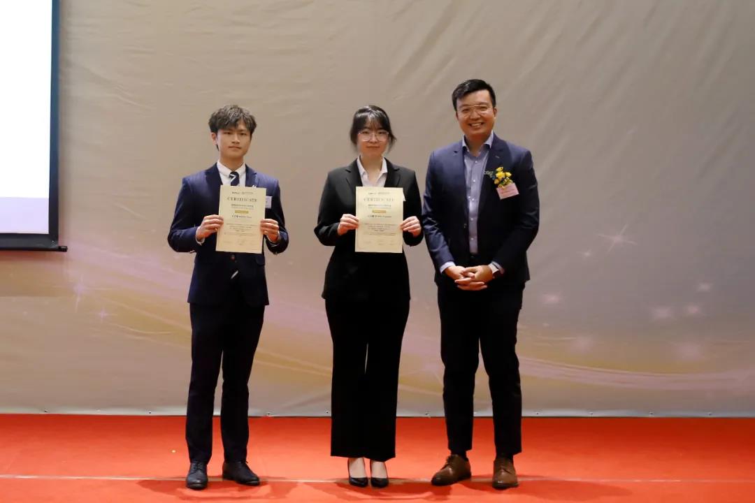 蜜蜂科技联合创始人林鸿为王月娇以及其他获奖者颁发蜜蜂科技Beeplus奖学金