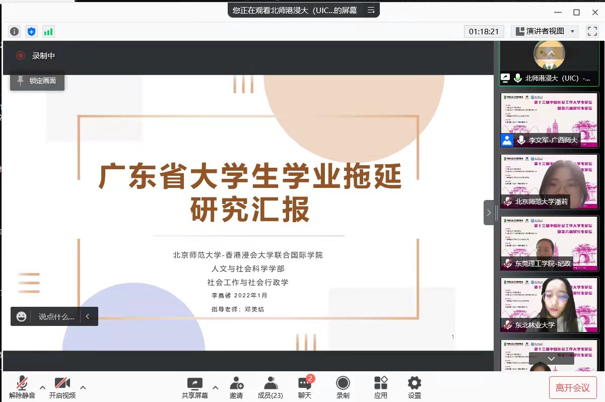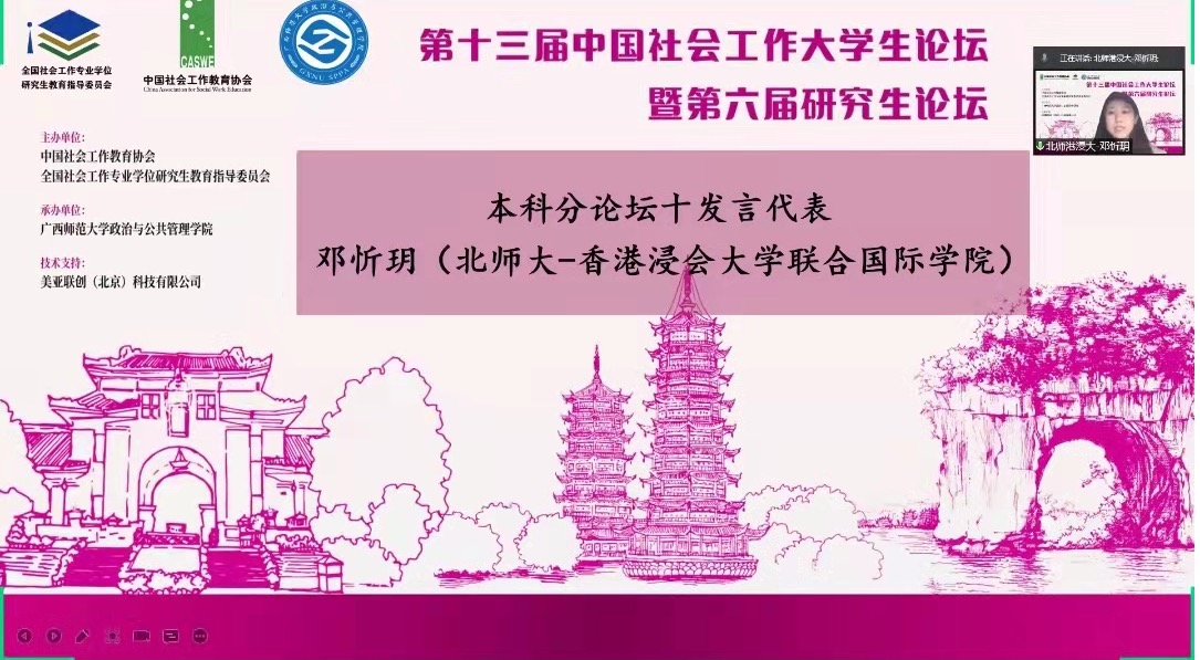 2022年1月17日至18日, 社工专业18级邓忻玥,17级江妍静,16级李嘉馨参加了第十三届中国社会工作大学生论坛暨第六届研究生论坛并在分论坛发表了演讲。本次论坛由中国社会工作教育协会和全国社会工作专业学位研究生教育指导委员会联合主办,广西师范大学承办,以:“奋斗百年路 启程新征程:社会工作发展与实践的新担当”为主题,基于疫情防控的考虑,本次论坛全部采用线上的方式进行,围绕“社区工作参与乡村振兴”、“人口老龄化应对”、“社区治理”、“环境治理”、“从常态化疫情防控”、等十六个主题深入交流和互动,共来自全国各高校的395名同学投稿报名。