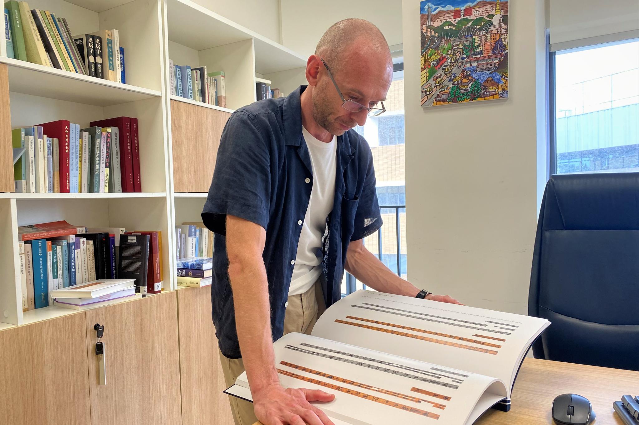 Yegor Grebnev reads a collection of bamboo slips in his office at the Beijing Normal University-Hong Kong Baptist University United International College in Zhuhai, Guangdong province.