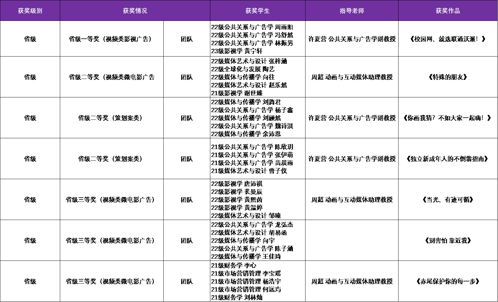 恭喜这些优秀的同学以及感谢公共关系与广告学专业许夏营副教授以及动画与互动媒体专业周超助理教授的不吝指导。以上作品均已经报送到国家赛区,祝愿这些同学们能在国家赛区里脱颖而出,获得优异的成绩!