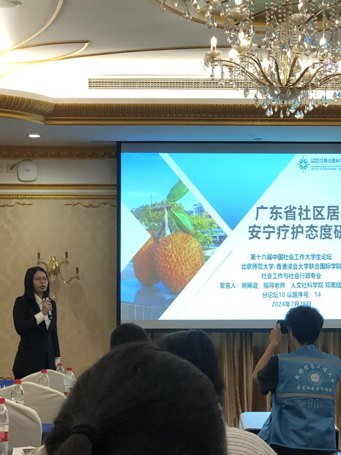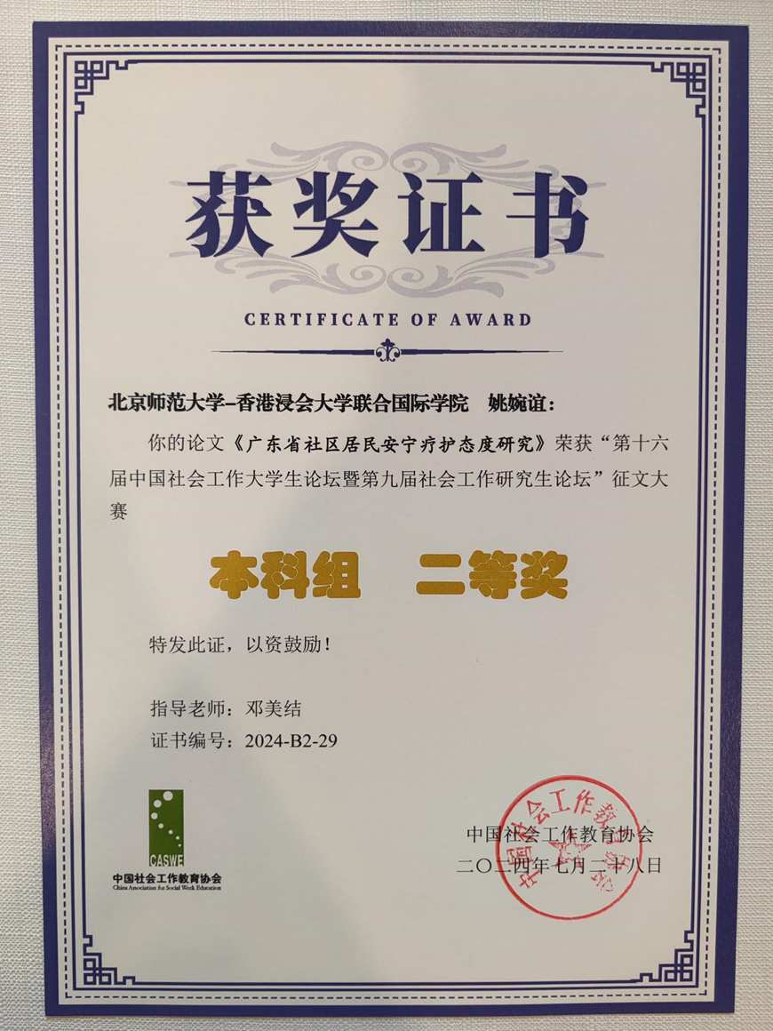 近日,由中国社会工作教育协会主办,成都信息工程大学承办,四川省共计14家社会工作服务机构协办的“中国式现代化新进程中我国社会工作的发展与创新——第十六届中国社会工作大学生论坛暨第九届社会工作研究生论坛”于四川省成都市顺利进行。在本次论坛中,我校24届社会工作与社会行政专业学生姚婉谊投稿的论文"广东省社区居民安宁疗护态度研究"在本科组比赛中荣获二等奖。