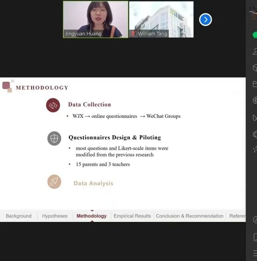 麦嘉仪同学的论文题目为:Effects of English-medium Instruction on Students’ Willingness to Communicate in L2 in EMI Universities,她感谢导师Freek Olaf de Groot博士的指导,在“二语交际意愿”的领域采用定量加定性的研究方法开展研究。副教授甄美仪则在学术语言和论文格式等方面给她提供帮助。