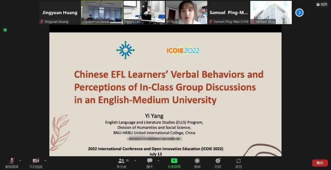 2022年7月,UIC 2018级英语语言文学专业麦嘉仪、杨熠、黄靖媛、陈宣颖和郑雨宁五位同学在线参与在香港举行的2022开放与创新教育国际会议(ICOIE 2022)并发表论文。其中,麦嘉仪获得本届大会最佳学生论文奖。