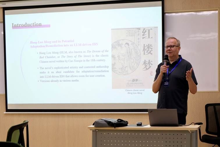 Jussi Holopainen 教授 以《生成式人工智能时代的经典重释——以〈红楼梦〉为例》为题,展示了人工智能如何在不削弱文化细腻性的前提下,为经典文学创造新的阐释方式。他指出:人工智能并不是取代解读的“黑箱”,而是一位“设计合作者”,促使研究者和设计者做出更清晰的诠释选择。