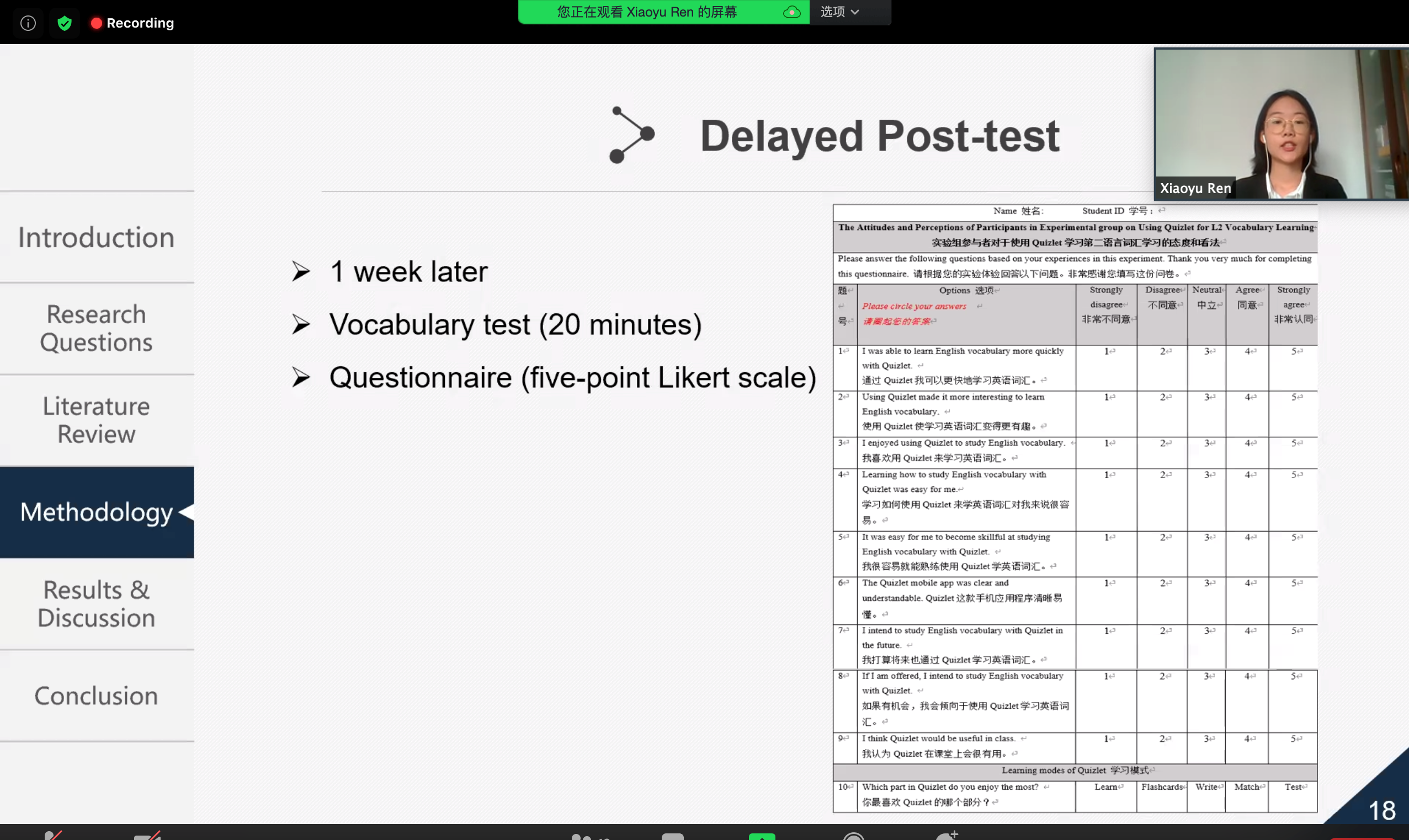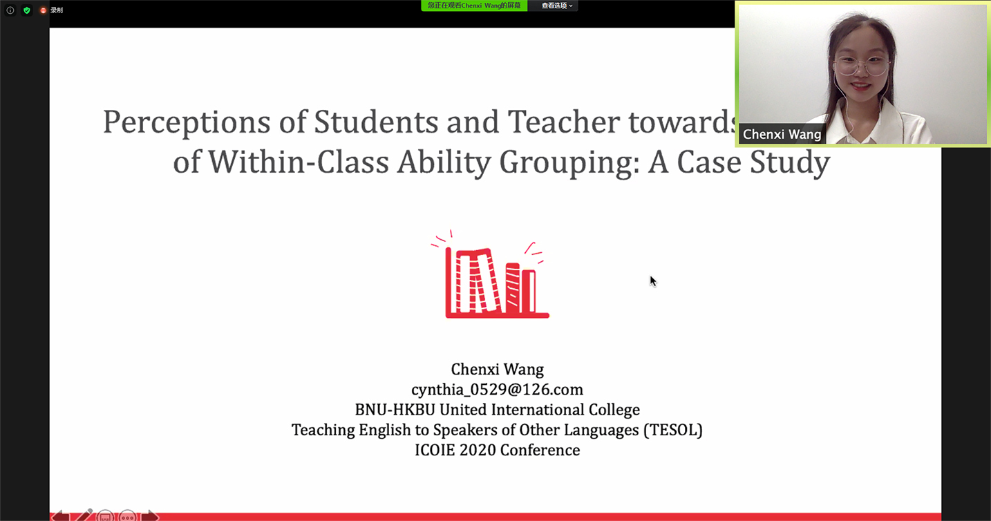 我感到非常荣幸能够参加ICOIE 2020国际会议,并展示自己的研究成果。虽然有点可惜因为新冠疫情改到了线上,但我仍然受益匪浅,这将会是我人生中一段难忘的经历。在短短的三天里,我听到了知名学者带来的富有创新性和启发性的主题讲座,让我对现代科技怎么有效地与教学相结合有了新的认识和了解。我也从其他演讲者的研究项目中学到了很多,包括他们的研究方向,研究过程和研究成果。除此之外,在我的演讲中,听众向我提出的问题让我对自己的研究领域有了更深刻的思考,也为我将来的研究指明方向。希望自己今后能够有更多机会参加有关教育的国际会议。最后,我想对我的导师杨丽娟博士表示最真切的感激,她在我前期的准备工作上给了我许多帮助和支持。