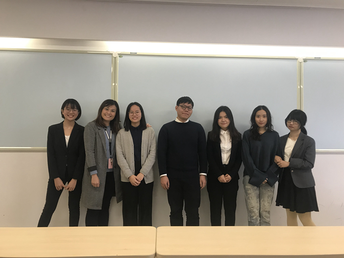 大三时,张紫昕(左一)和小组成员presentation(口头报告)结束后与任课老师林彩丽(Chally Lim)博士(左二)合影