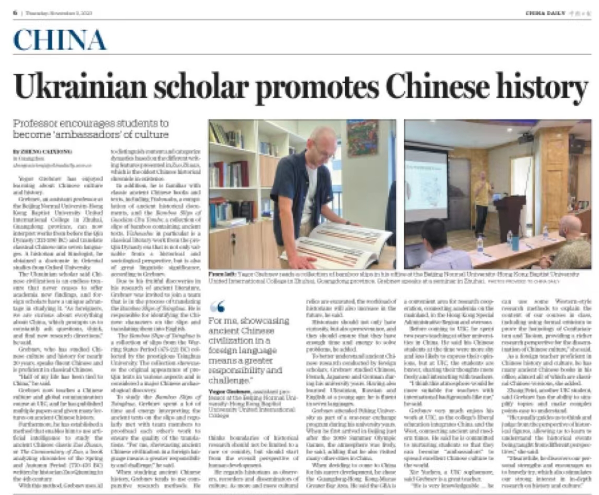 近日,《中国日报》(China Daily)发表对北师港浸大(UIC)中华文化与国际传播专业助理教授Yegor Grebnev(葛觉智)的英文专题报道Ukrainian scholar promotes Chinese history,讲述葛觉智博士对中国古代史和中华文化研究的心路历程及在UIC的教学心得。
