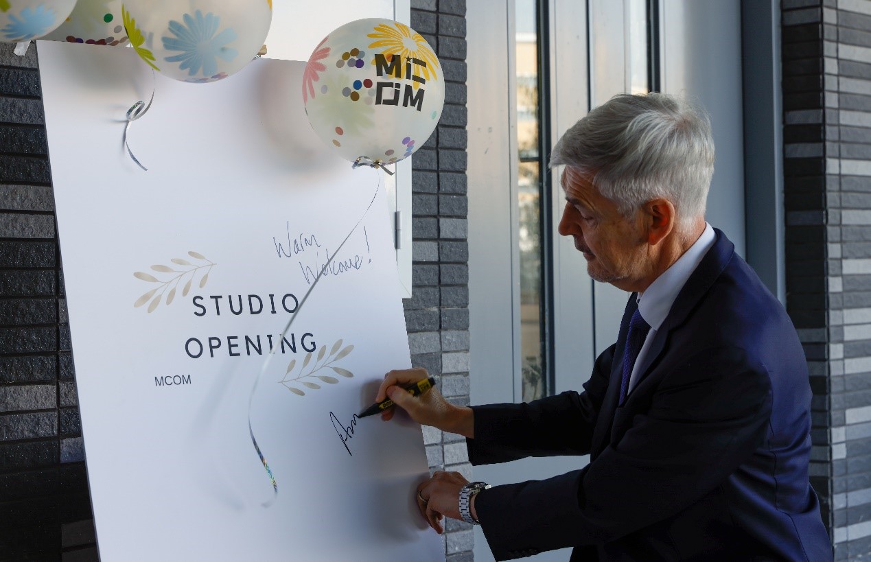 After having his portrait photograph taken, Prof. Adrian Bailey, Dean of DHSS, wrote “Warm Welcome!” on the white paper board outside the door of the newly opened Digital Media Studio of MCOM in CC-205.