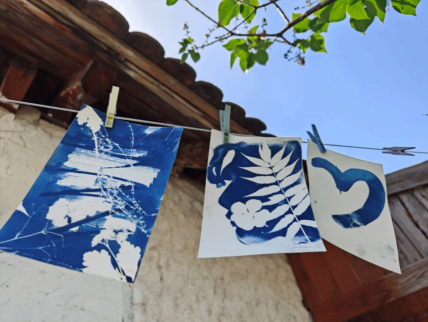 拍摄与展映之余,学生们还体验了1842年发明的蓝晒工艺,用野花创作“蓝图”。随着阳光洒落,化学物质渐渐显现出图案,“科学就这样孕育出属于它的诗意,”李雨珊举着渐渐显现的作品感叹道。在画廊厨房里,学生们做了中餐,和当地人交流菜谱,又一次拉近着彼此的距离。